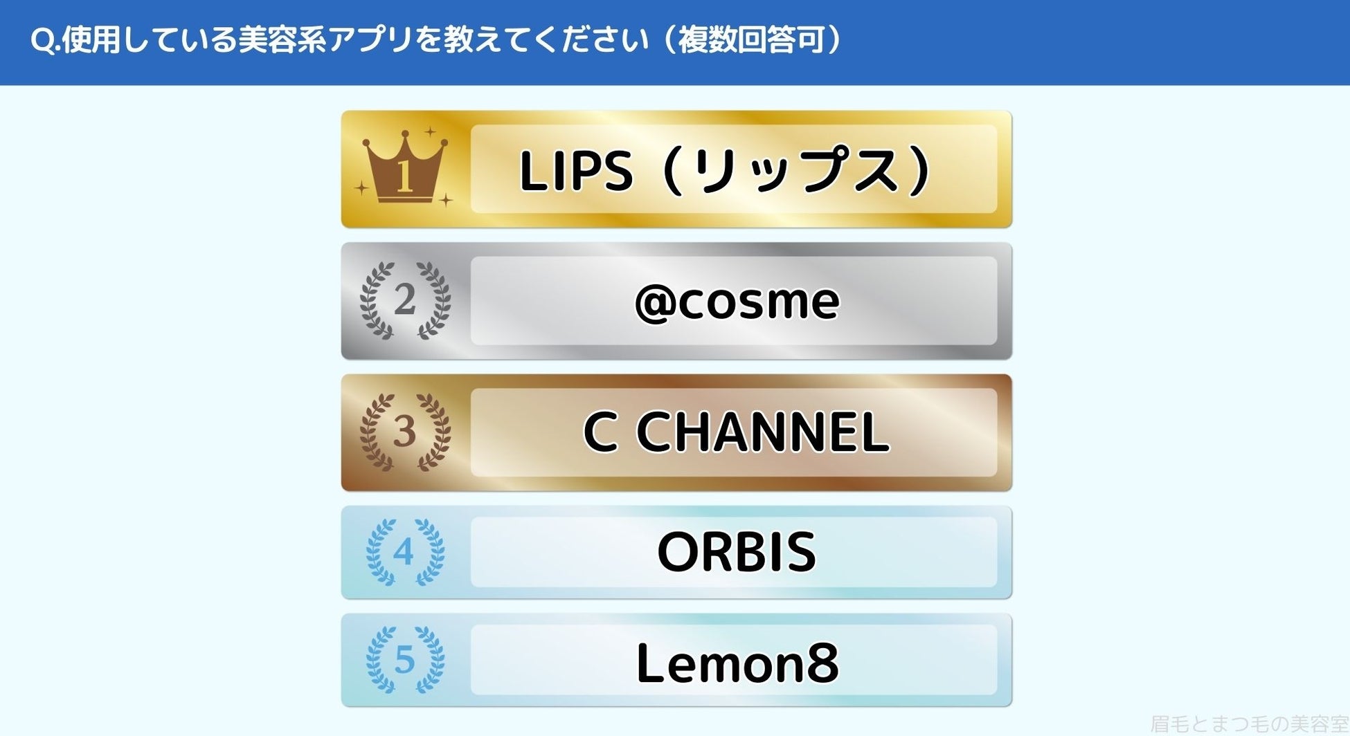 インストールしている美容系アプリをお聞きしたところ「1位>LIPS(リップス)」、「2位@cosme」、「3位>C CHANNEL」、「4位>ORBIS」、「5位>Lemon8」という結果になりました。