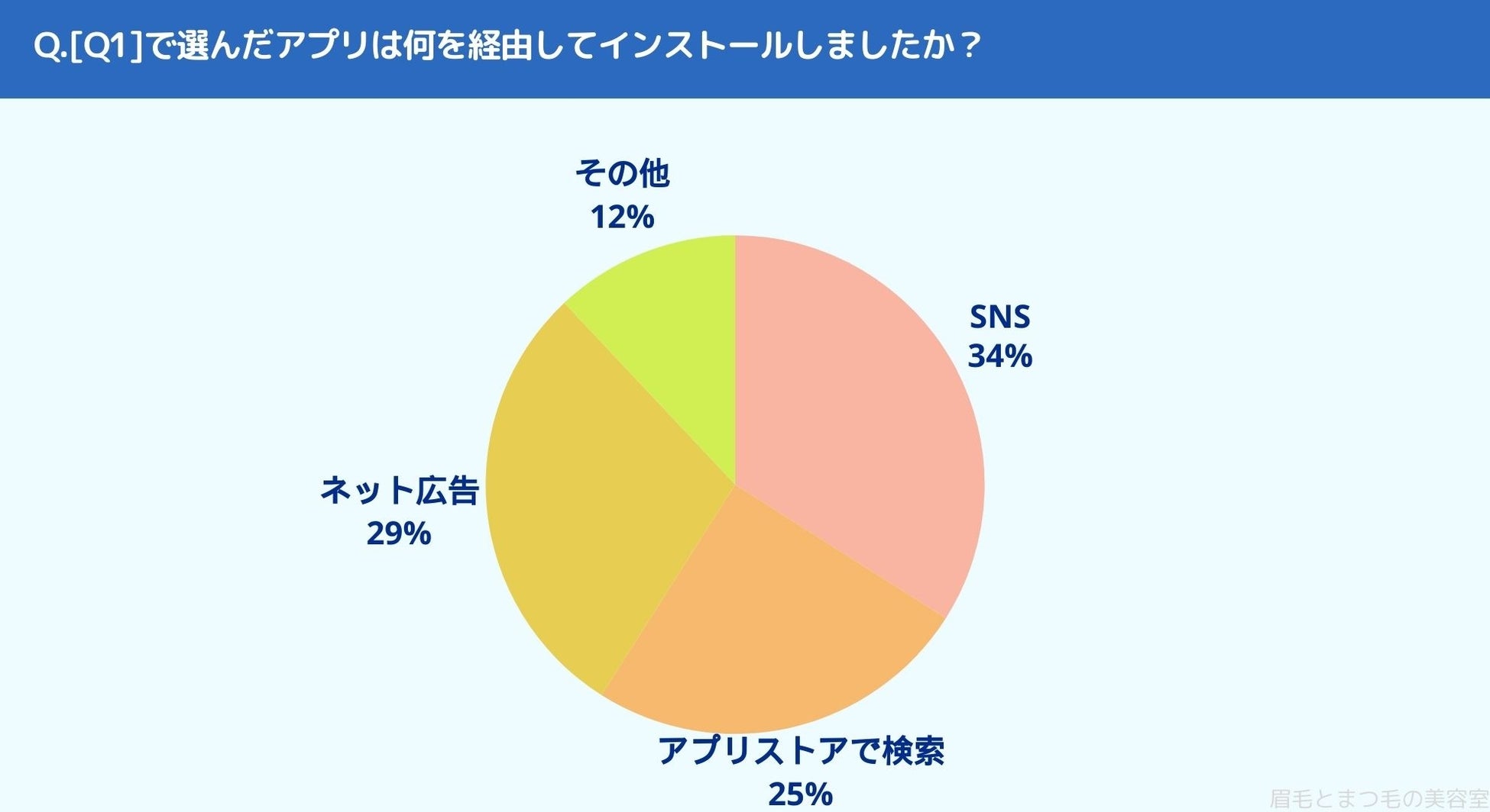 美容系アプリは何を経由してインストールしたかお聞きしたところ「SNS(34%)」、「アプリストアで検索(25%)」、「ネット広告(29%)」「その他(12%)」という結果になりました。