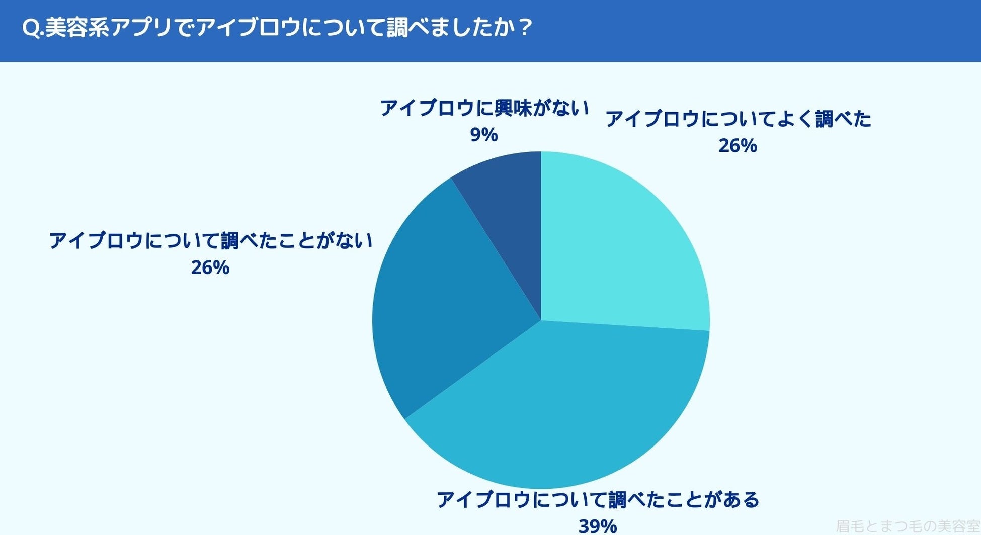美容系アプリでアイブロウについて調べたかお聞きしたところ「アイブロウについてよく調べた(26%)」、「アイブロウについて調べたことがある(39%)」、「アイブロウについて調べたことがない(26%)」、「アイブロウに興味がない(9%)」という結果になりました。