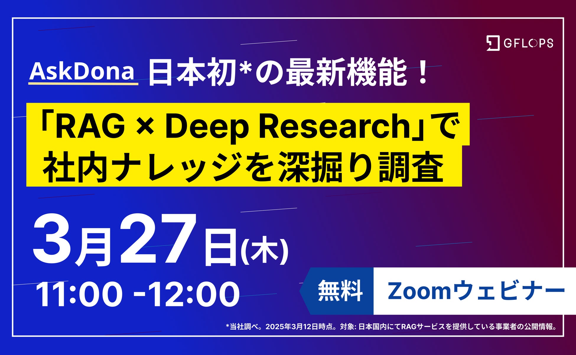 株式会社GFLOPS(本社:東京都渋谷区、代表取締役CEO:盛本マリア、共同代表:鈴木亮祐)は、日本初*となる「RAG×Deep Research」の機能について解説する無料ウェビナーを開催します。