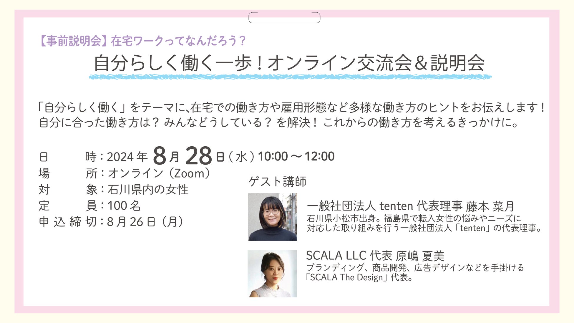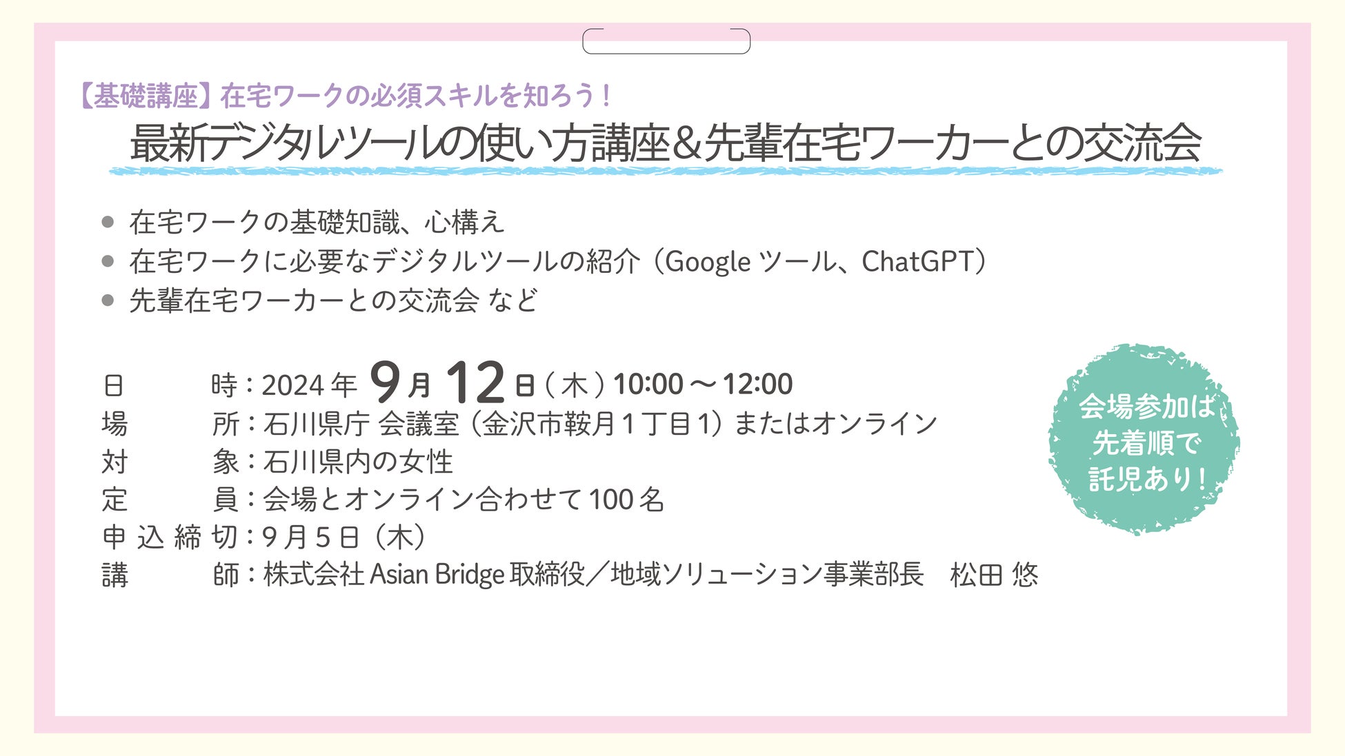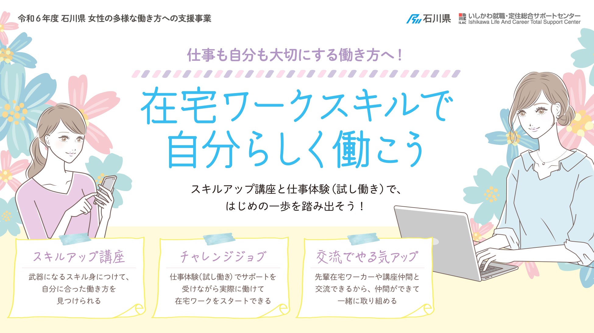 石川県及びいしかわ就職・定住総合サポートセンター(運営:株式会社Asian Bridge)は、石川県内の女性を対象に、在宅ワークや就業機会の提供など多様で柔軟な働き方に向けたセミナーや講座を開催いたします。
