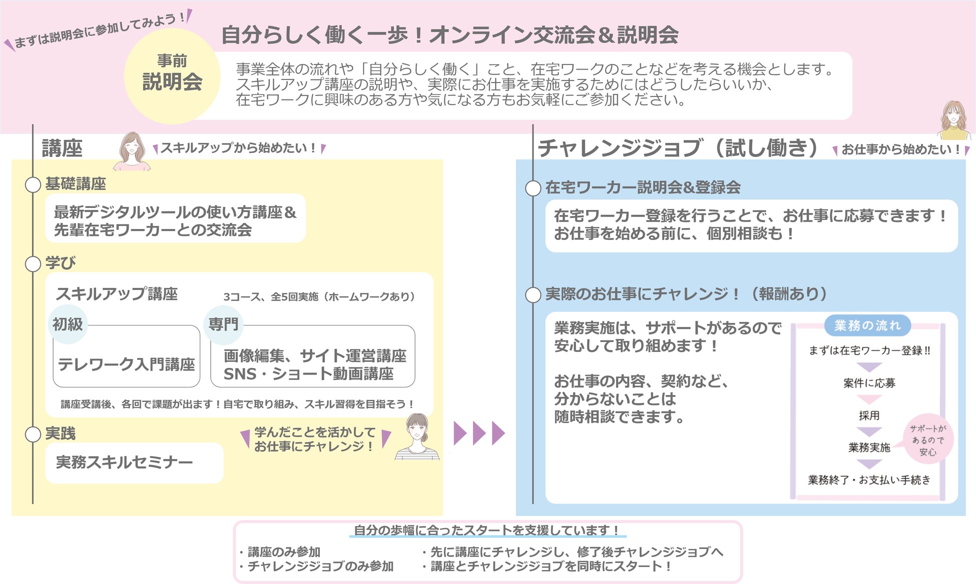 また、今後の基礎講座やスキルアップ講座、チャレンジジョブ(試し働き)についてもご紹介します。多様な働き方を知り、自分らしく働くことを考えるきっかけとしていただきたいです。