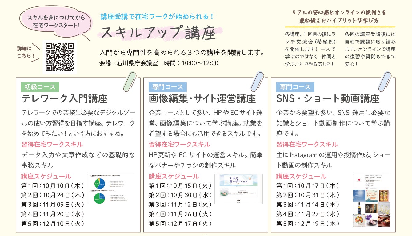 石川県及びいしかわ就職・定住総合サポートセンター(運営:株式会社Asian Bridge)では昨年度に続き、石川県内の女性を対象として、一人ひとりの事情に応じての就労が可能となるよう、多様で柔軟な働き方に向けた講座や仕事体験を実施いたします。昨年度の事業に参加された方も、ご参加いただけます。