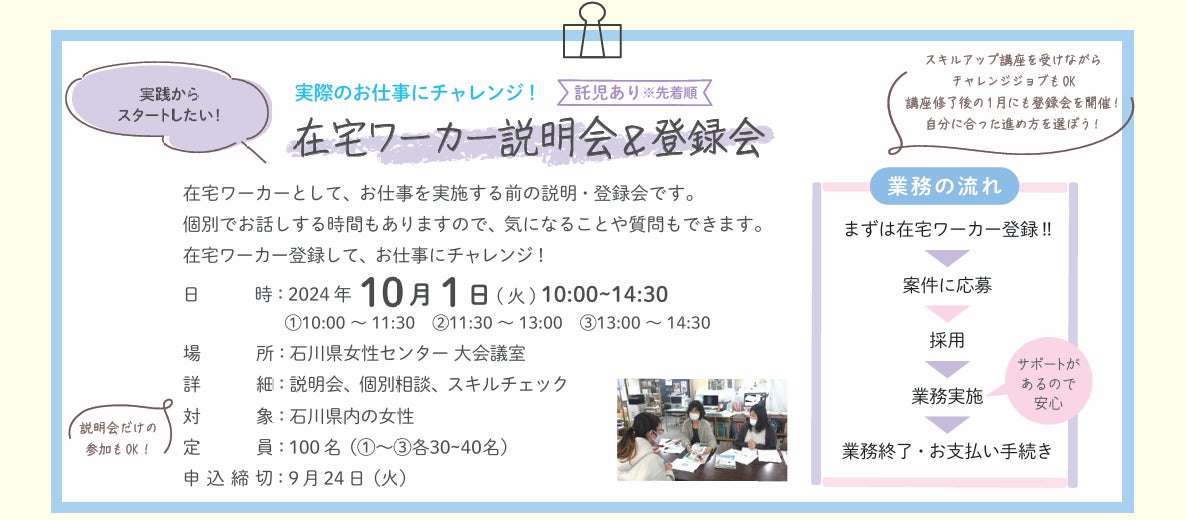 ※2023年9月、2024年1月に開催した説明会&登録会で在宅ワーカー登録をされた方は、今年度は再登録不要でチャレンジジョブにご参加いただけます。