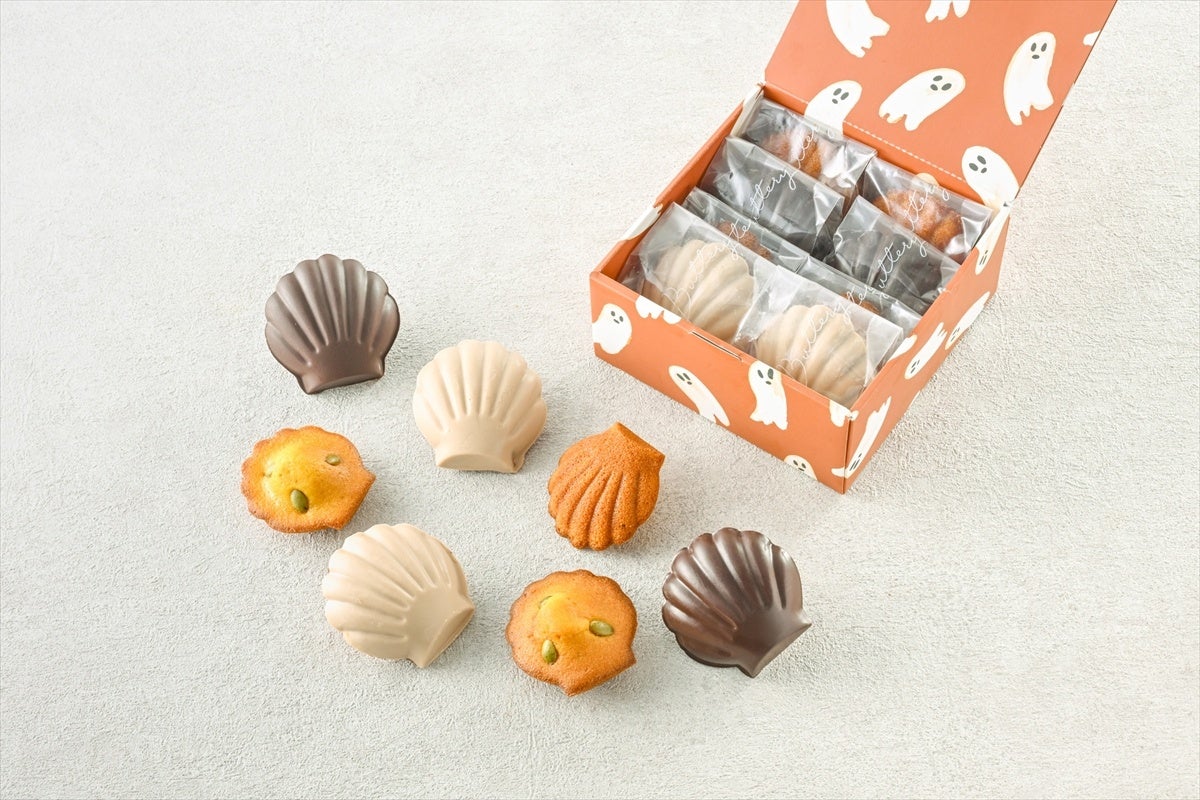 他にも、おばけのデザインとアプリコットオレンジが印象的な『ハロウィン限定BOX』が新登場します。「栗」や「かぼちゃ」など、秋を感じる新作マドレーヌを4種類詰め合わせました。マロンペーストと刻んだ渋皮栗を合わせて焼き上げた生地に、チョコレートをコーティングした「栗」。優しい甘さの「かぼちゃ」にはパンプキンシードを添えて、塩味と食感のアクセントを加えました。他にも、北海道バターの香りとコクが楽しめる「プレーン」と「チョコ」をアソートしています。