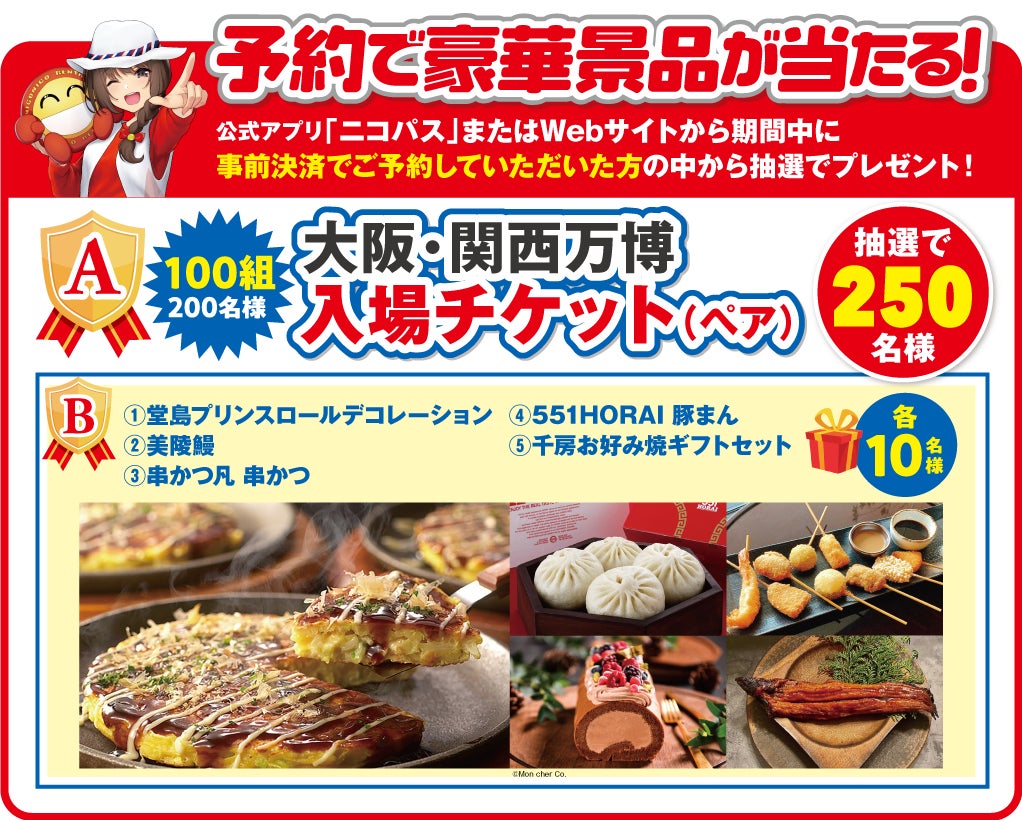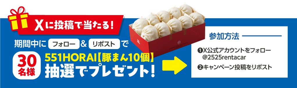 公式アプリ「ニコパス」または公式WEBサイトから事前決済でレンタカーをご予約いただいた方を対象として、抽選で大阪・関西万博 入場チケットなど素敵なプレゼントが当たる「ニコレンで大阪を楽しもう!キャンペーン」を3月31日(月)まで開催。また同期間中、公式Xのフォロー&投稿で豚まんが当たるSNSキャンペーンも同時開催しています!