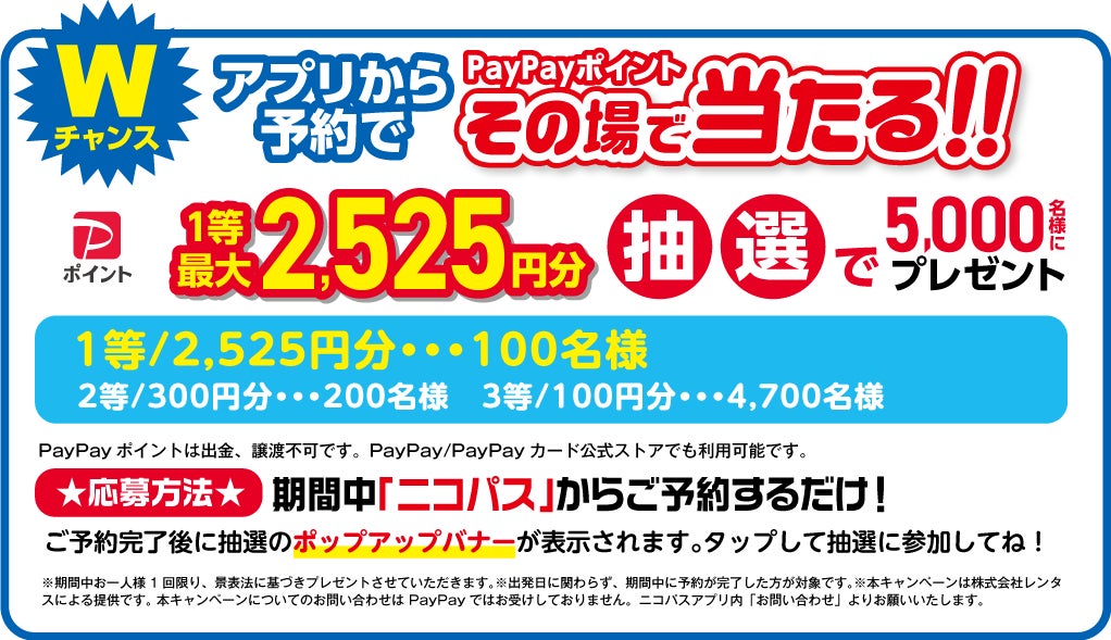キャンペーン期間中、公式アプリ「ニコパス」からレンタカーをご予約いただいた方