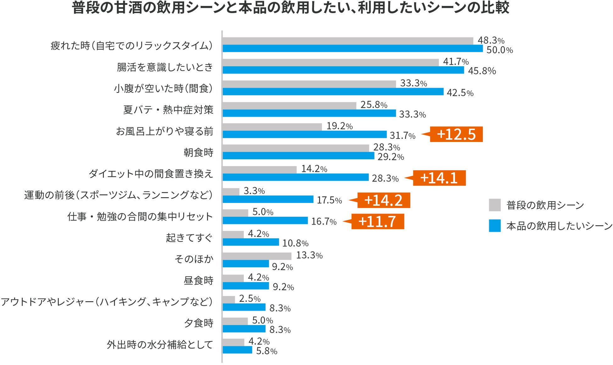 味の満足度調査では、すっきりした味わいから通常の甘酒と異なるシーンでも飲用したいという評価が多く寄せられました。夏バテ・熱中症対策が上位になったほか、「お風呂上がりや寝る前」「ダイエット中の間食置換え」「運動前後」「仕事・勉強の合間の集中リセット」と、この商品ならではの新しい飲用シーンがあげられました。
