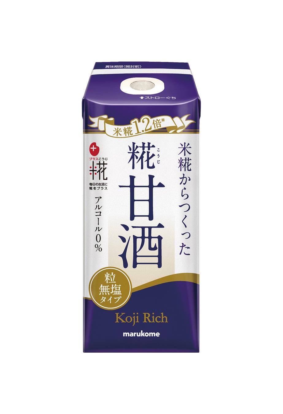 自社従来品「糀甘酒」と比較して1.2倍の米糀をつかった無塩タイプの糀リッチ粒。糀の粒を残し、糀の甘みを感じられる味わいに仕上げています。容量とパッケージの形状を変更しました。