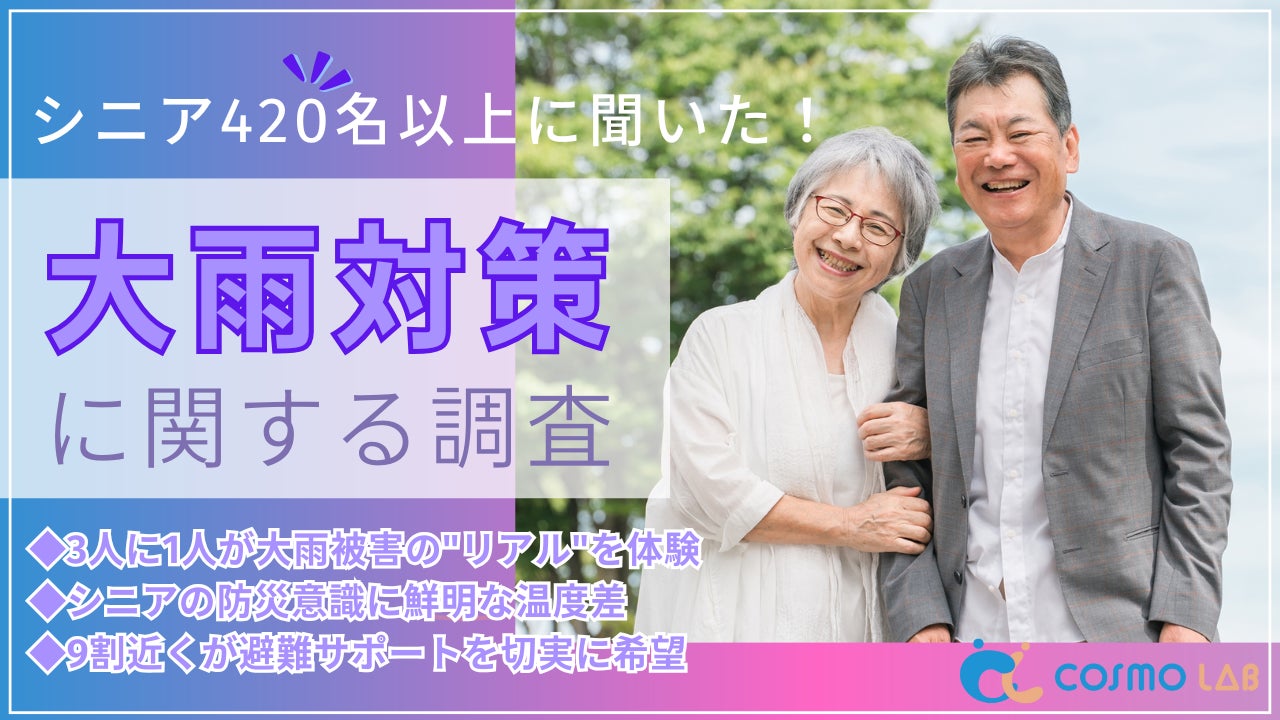 シニア専門のマーケティングプラットホーム コスモラボ(会社名:コスモヘルス株式会社、本社:東京都港区、代表取締役社長 小塚 崇史)がシニア層の『大雨対策』に関するアンケートリサーチのレポートをリリースしました。本レポートでは、50代以上のシニア層426名を対象に、大雨被害の実態や備えに関するアンケート調査結果を分析しました。大雨の経験や対策・情報源・支援意識などの観点から、シニア世代の防災行動の傾向と課題が明らかになりました。