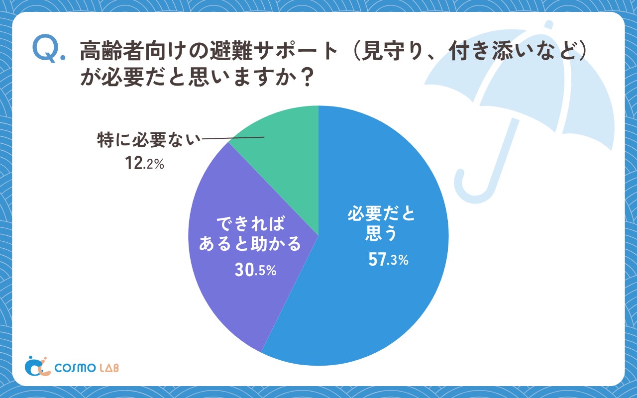 「必要だと思う」(57.3%)と「できればあると助かる」(30.5%)を合わせると、全体の87.8%が支援を求めています。「特に必要ない」は12.2%にとどまります。移動や判断に不安を抱える高齢者が多く、避難所までの同行支援や地域見守り体制の整備が急務であることが示されました。