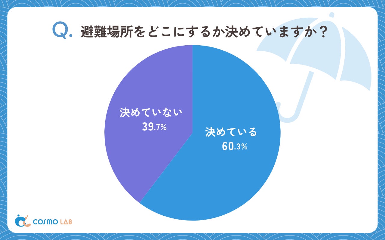 「決めている」人は全体の60.3%で、「決めていない」(39.7%)とほぼ6:4の割合となりました。避難先が明確でない層が4割存在することは、いざという時の混乱を招く可能性があります。