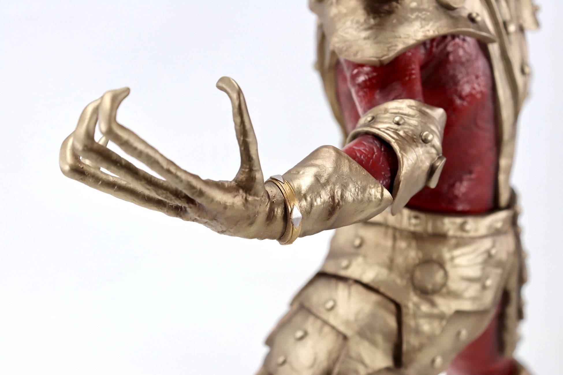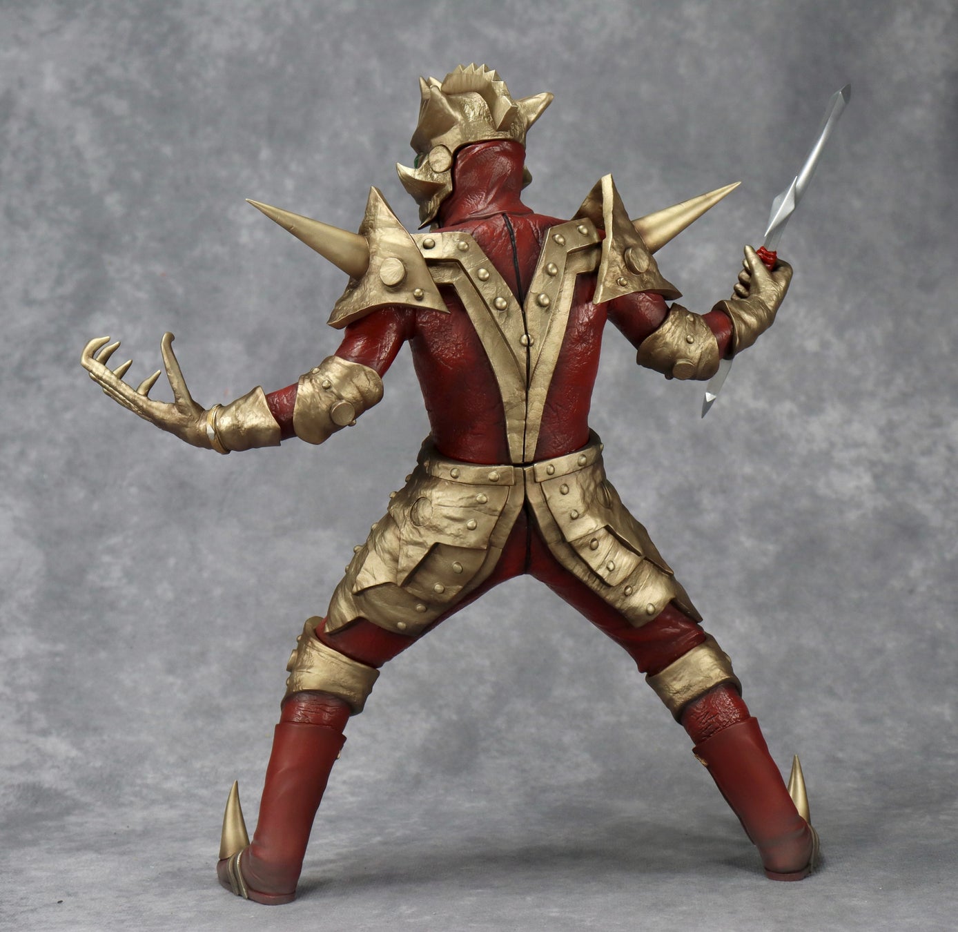 少し傷んだような鎧部分のシワなど質感も資料に準じて造形し、スーツ部分の小じわとのテクスチャ感の違いも、差別化をして作り込んだ原型となっています。