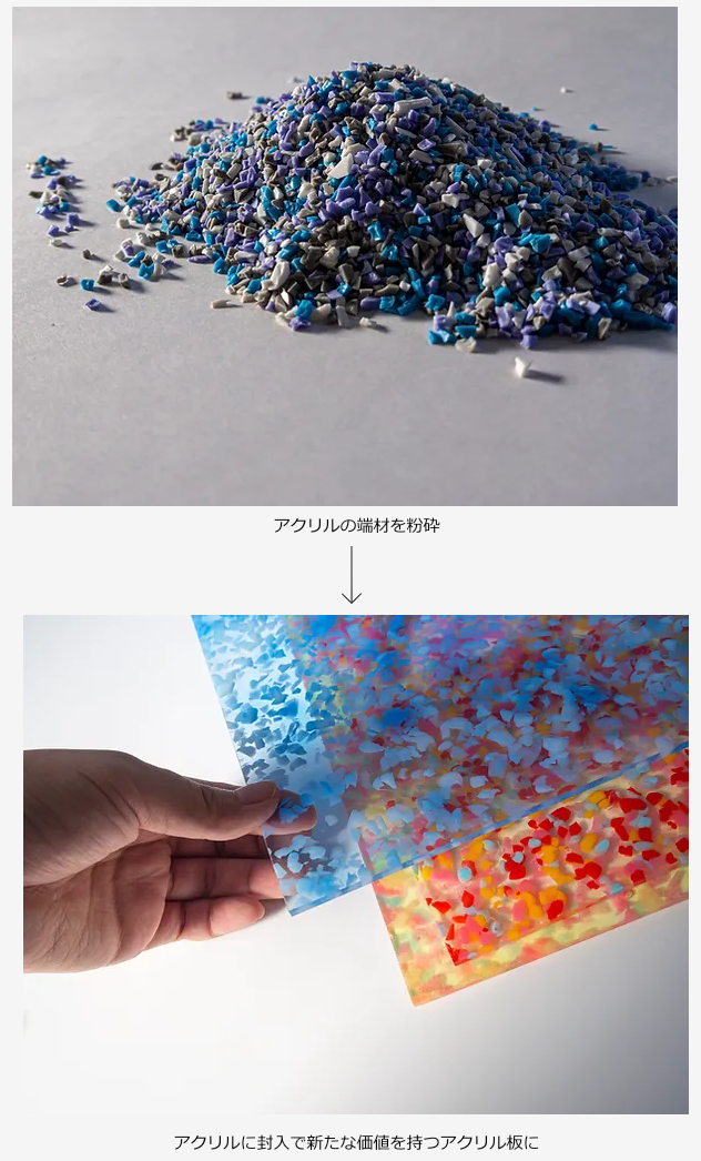 TOKYO ACRYLでは、SDGsへの取り組みとして、廃棄される素材(アクリル端材、顔料・染料など)を新たなアクリル板へと加工するアップサイクルにも取り組んでいます。アップサイクルだからこそ実現できる新たなデザインも魅力的です。