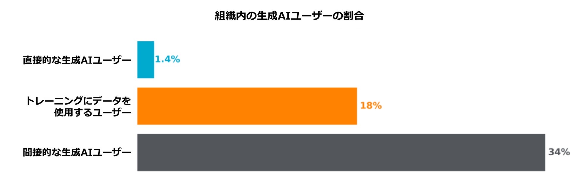しかし、従業員が直接生成AIを利用するケースはリスクの一部に過ぎません。AIの普及に伴い、新たなリスクも増加しています。日本では、従業員の3人に1人以上(34%)が生成AI機能を搭載したビジネスアプリを業務で使用しており、このような状況はほぼすべての日本企業(98%)で確認されています。さらに、従業員の約5人に1人(18%)は、AIモデルの学習のために収集したデータを利用するアプリを使用しており、このようなアプリは日本企業の94%で使われています。これらのアプリやアクティビティは必ずしもAIとして分類されておらず、AIセキュリティポリシーの対象外となっているため、セキュリティチームにとって重大な盲点となっています。