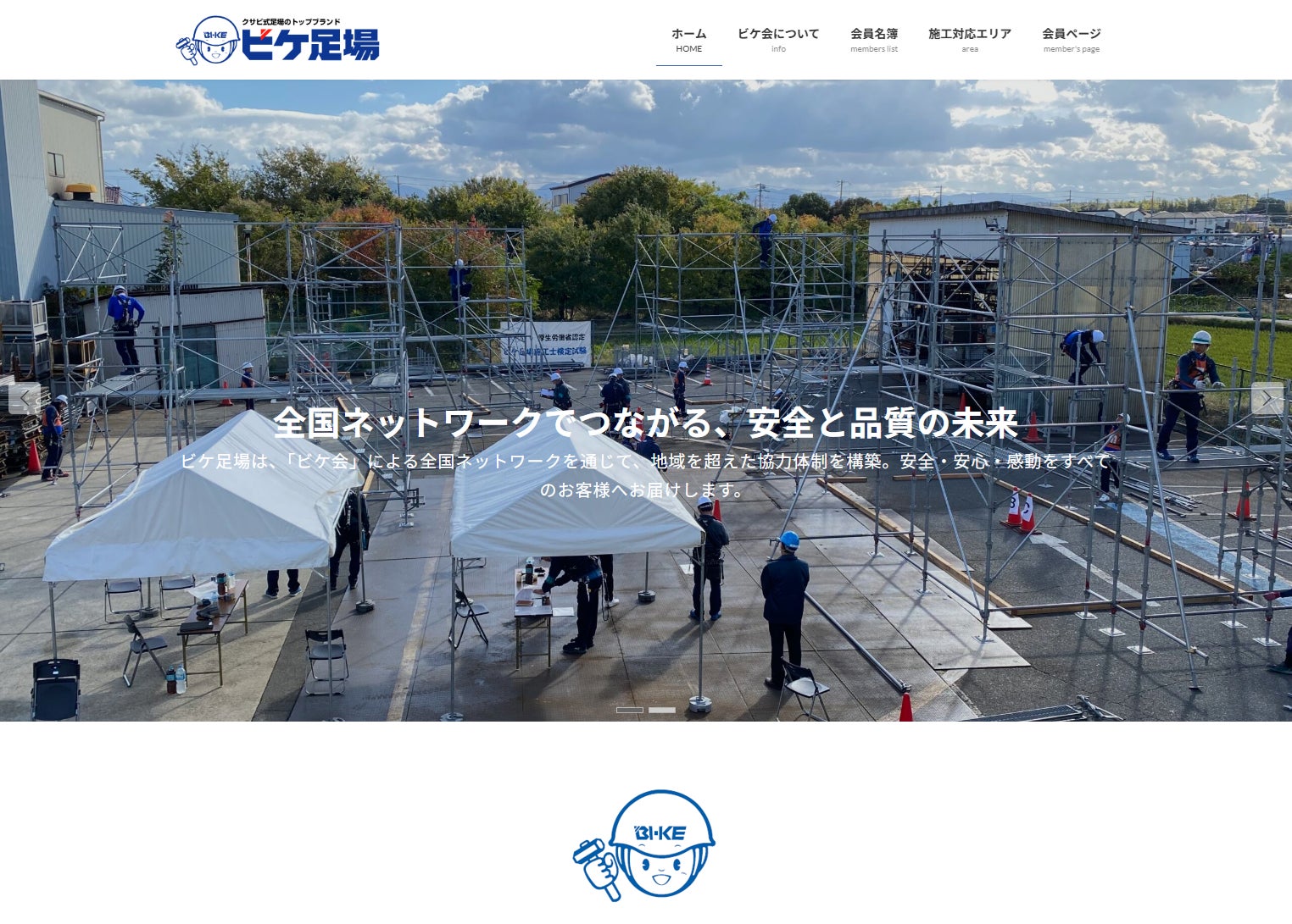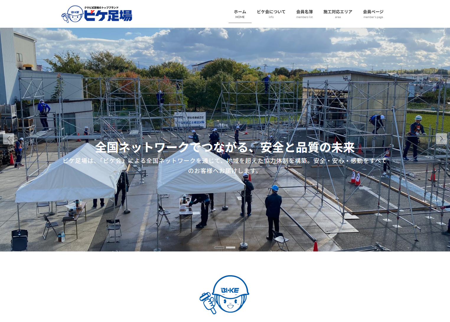 本WEBサイトでは、ビケ会の組織体制や関連団体をはじめ、事業規模、エリア別のサービス拠点数および年間施工棟数など、ネットワーク全体の概要を分かりやすくご紹介しております。あわせて、厚生労働省認定社内検定「ビケ足場施工」やビケ足場の主な特長、ビケ会会員名簿及び施工対応エリアを掲載しております。