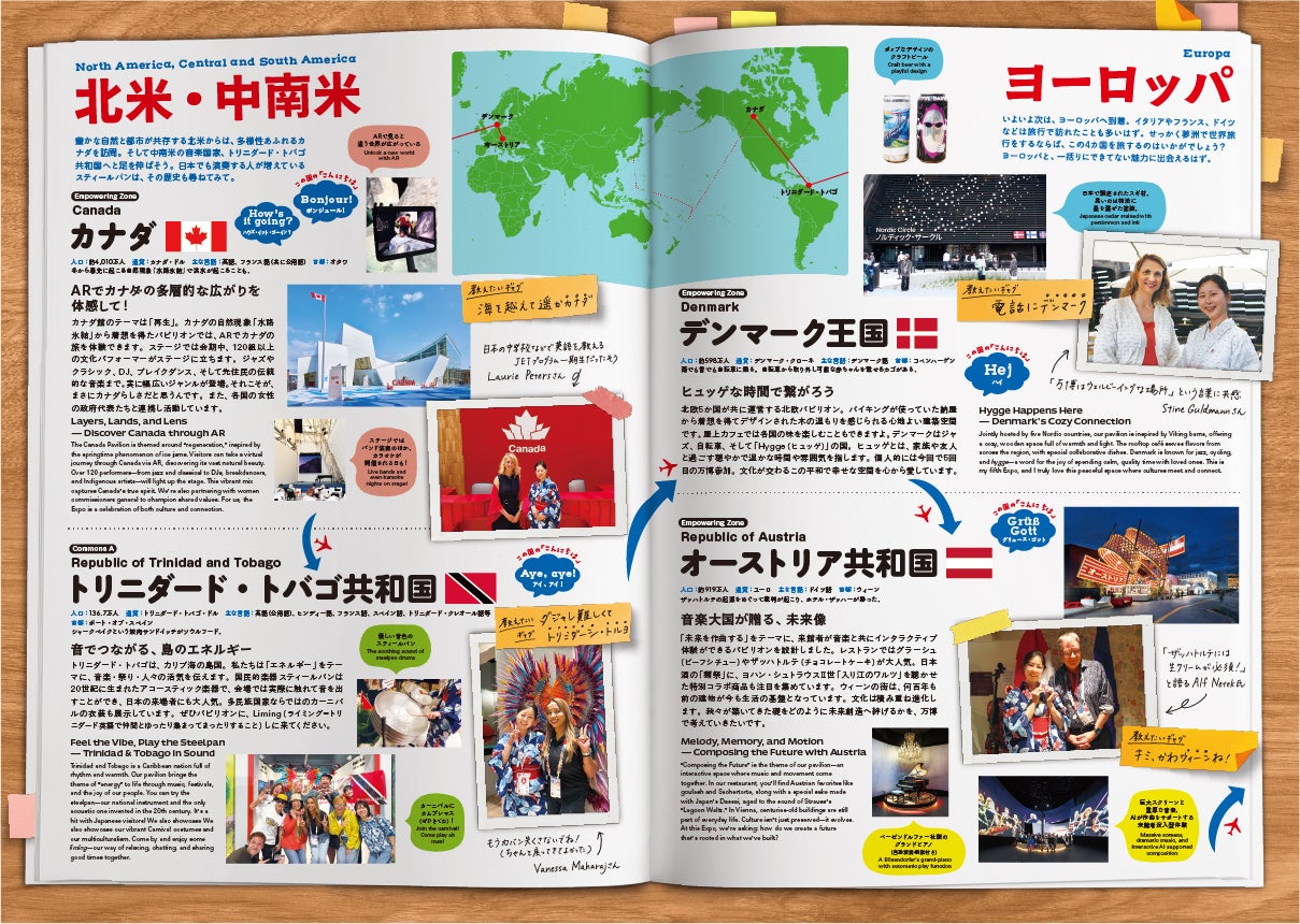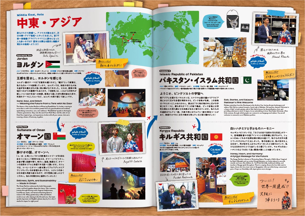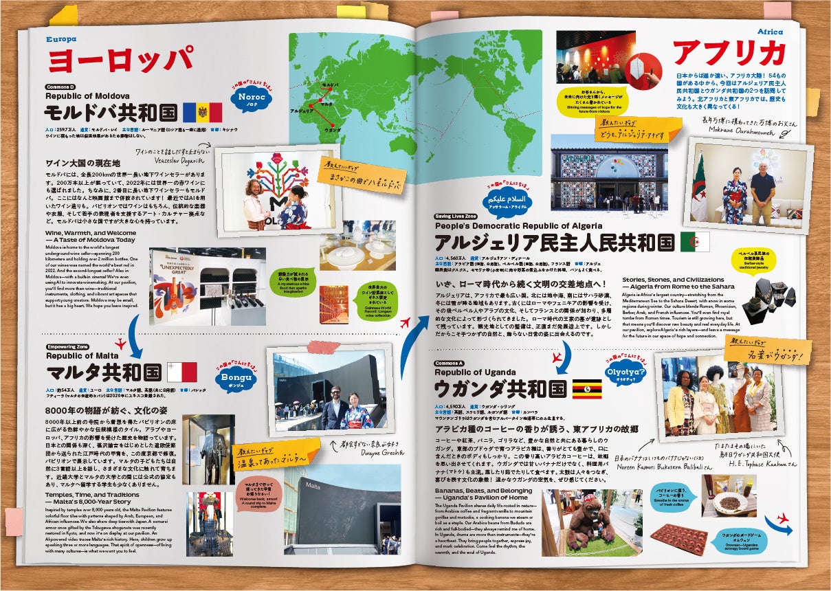 世界の196か国のうち、158の国・地域が参加している大阪・関西万博はまさに世界の縮図です。「一生かけても行けないかもしれない国の人々に会いたい」ー 誰しもそんな気持ちに胸を躍らせ万博会場へ向かいます。今号では、地下鉄やバスでも行ける世界一周の旅へご案内するパンフレットとして、夢洲発〜世界の大陸を巡る世界一周旅行を特集しました。各パビリオンスタッフによるご当地紹介も参考に、万博世代ならではの目線で世界旅行へと誘います。