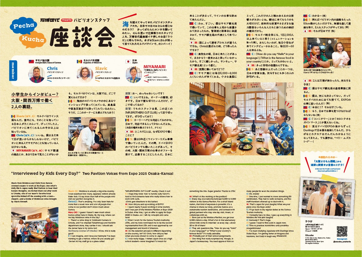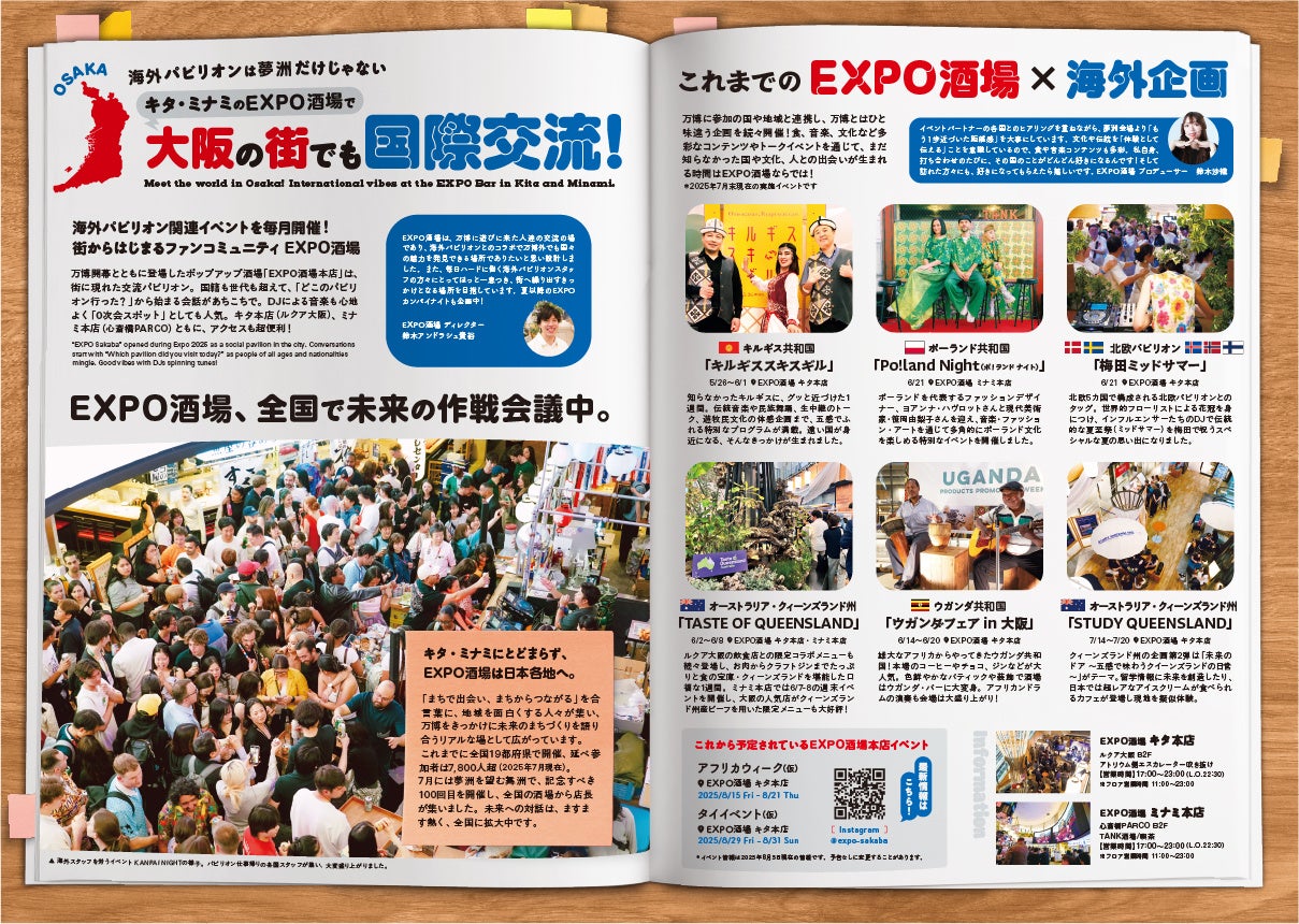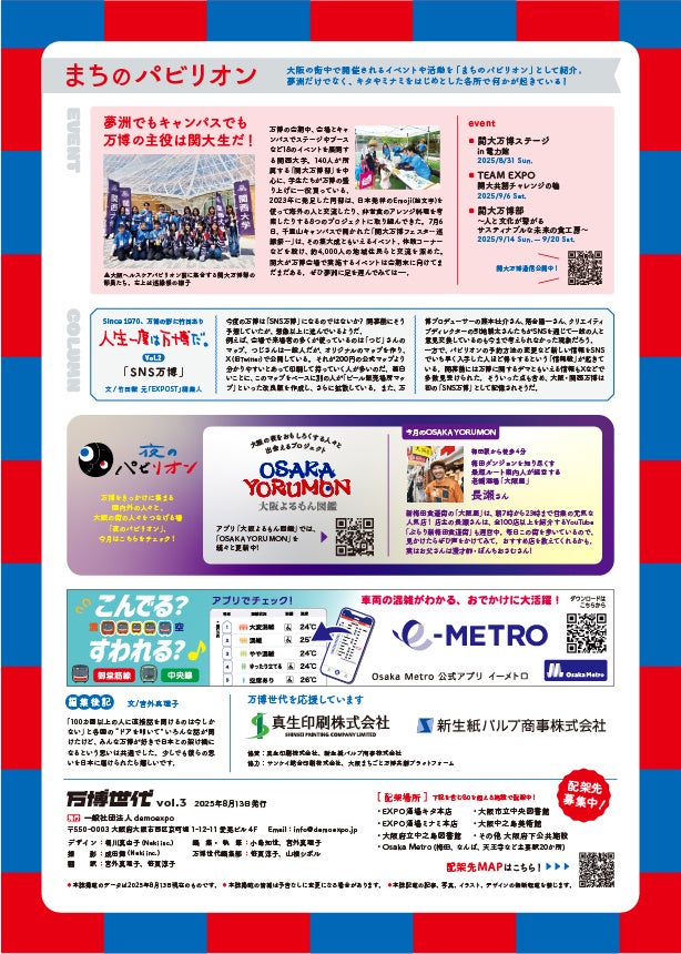 大阪にある大学の中でもいち早く学生主導で万博を盛り上げている関西大学・万博部の活動紹介や、万博世代前身となる旧EXPOST編集者の竹田徹氏によるコラム「人生一度は万博だ」の連載、よるもん店舗を紹介しています。