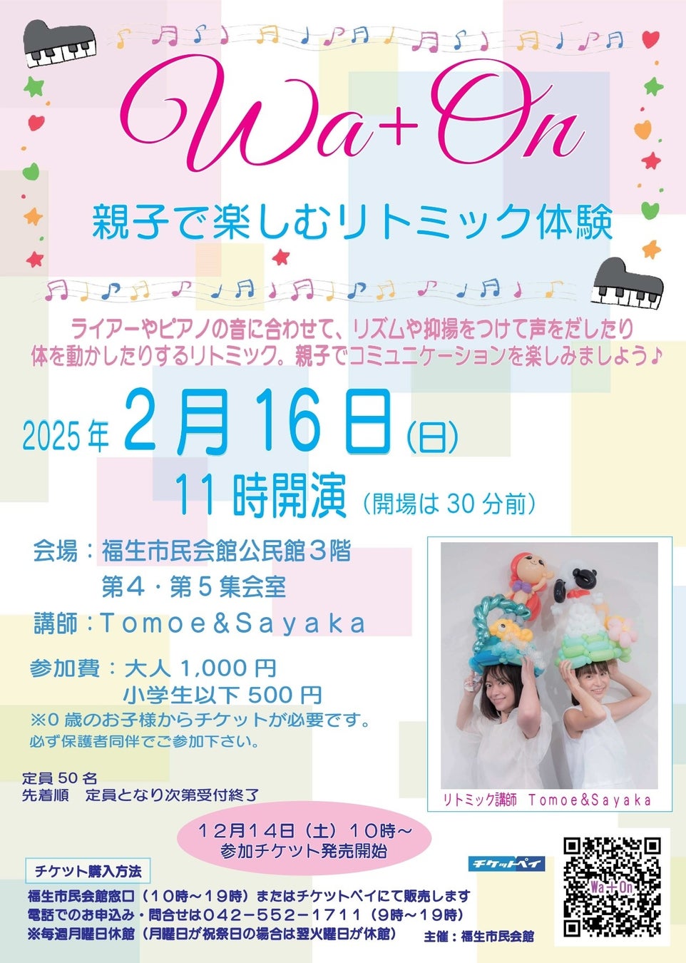 「チケットペイ」は、2025年2月16日(日)に福生市民会館 第4・5集会室にて開催いたします『Wa+On 親子で楽しむリトミック体験』のチケット販売を開始いたします。
