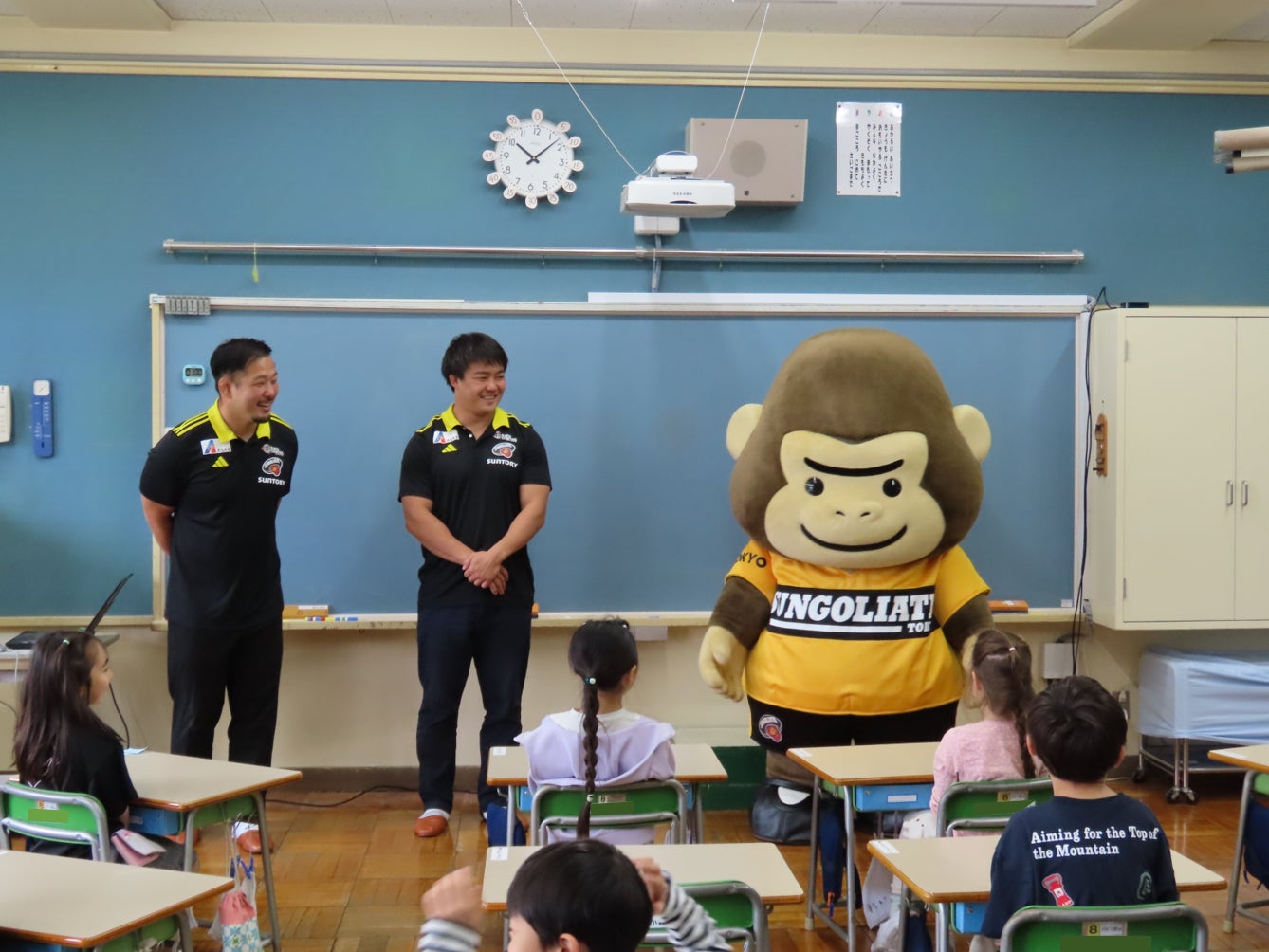 感謝状贈呈式には田中澄憲ゼネラルマネージャー、石原慎太郎選手、山本凱選手、サンゴリアス君が出席し、その後、子どもたちとも交流しました。
