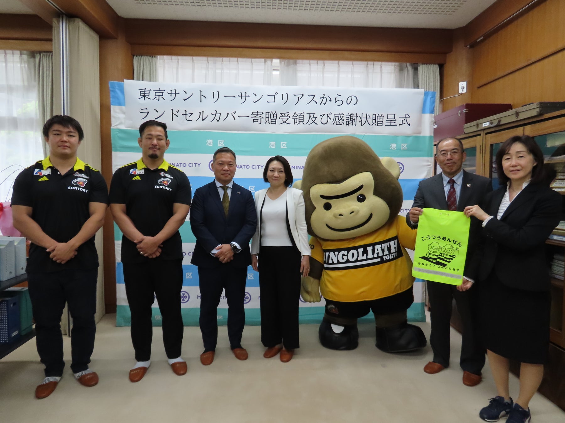 港区をホストタウンとするプロラグビーチーム「東京サンゴリアス」から、新1年生に向けてランドセルカバーを寄贈していただき、4月7日の入学式当日、港区立の小学校の新1年生に配布しました。