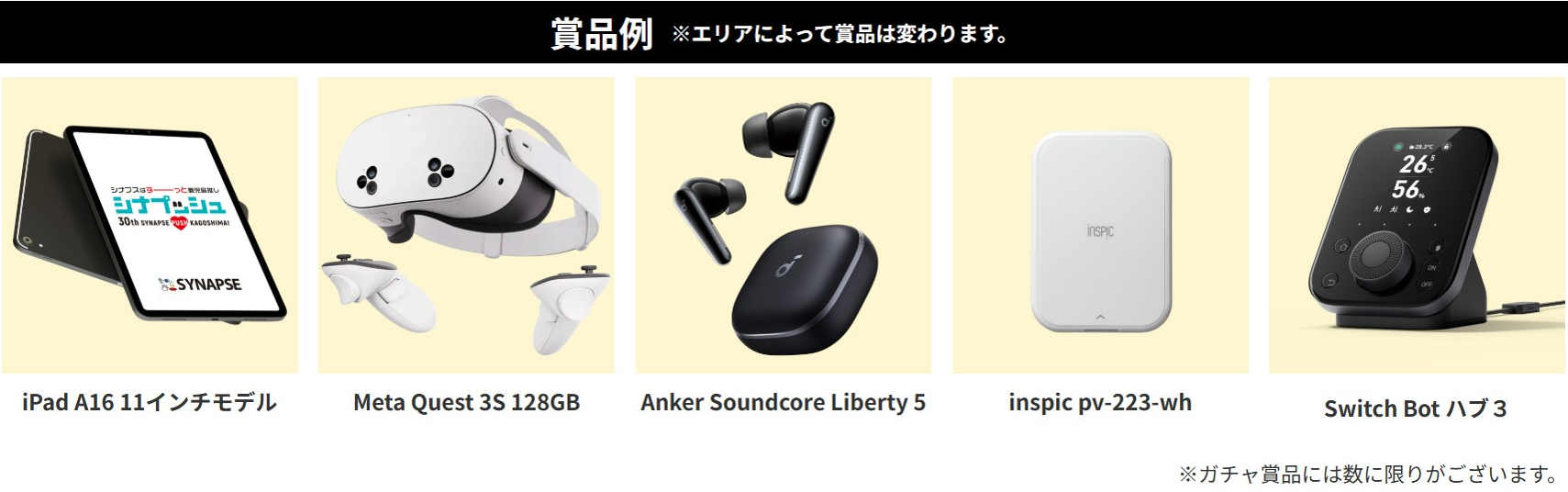 「シナプッシュ超巨大ガチャ!」のご参加にはシナプスのLINE友だち登録で空くじなしのガチャをまわそう!その場でiPadやメタクエストなど豪華デジタルガジェットや鹿児島推しグッズなどが当たる!※すでにLINE友だちになっている方も有効です