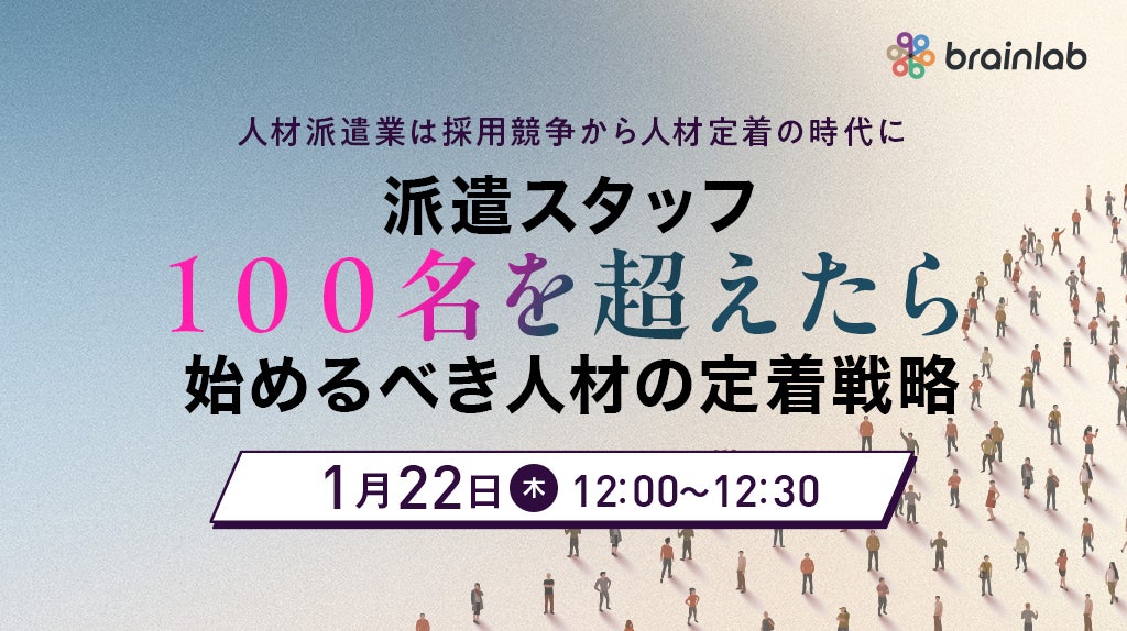 人材ビジネス向けシステム開発を行う株式会社ブレイン・ラボ(本社:東京都港区)は、2026年1月22日(木)12:00より、派遣事業の成長に不可欠な「スタッフ定着」に特化したオンラインセミナー『採用競争から定着支援へ:派遣スタッフ100名を超えたら始めるべき定着戦略』を開催いたします。
