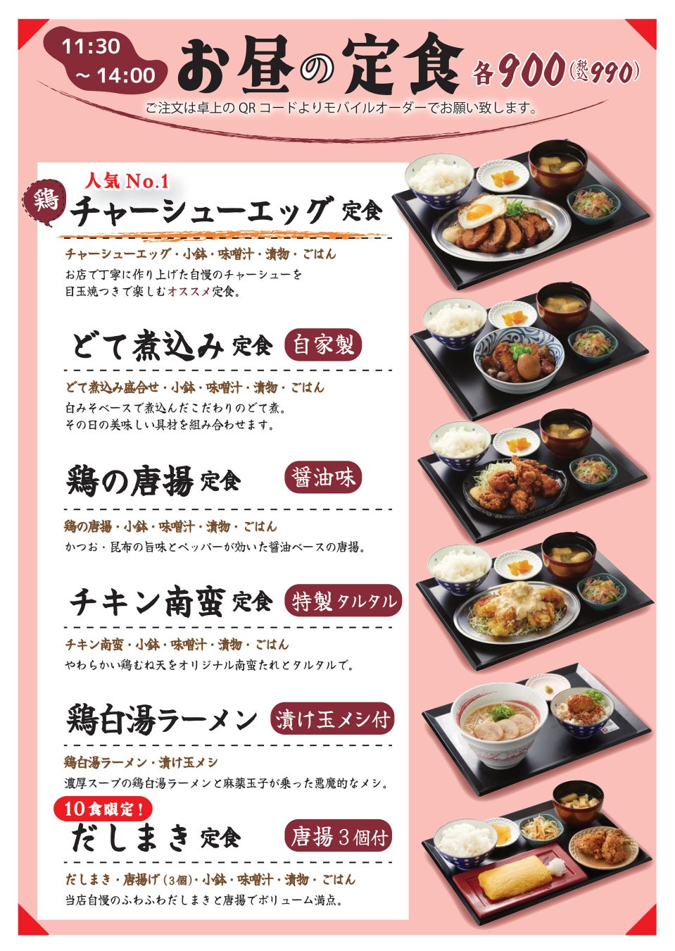 一番人気のチャーシューエッグ定食は、店舗仕込みの鶏チャーシューを分厚くカットし、マヨネーズと目玉焼きを添えて提供いたします。しっかり味のチャーシューはご飯との相性抜群です。