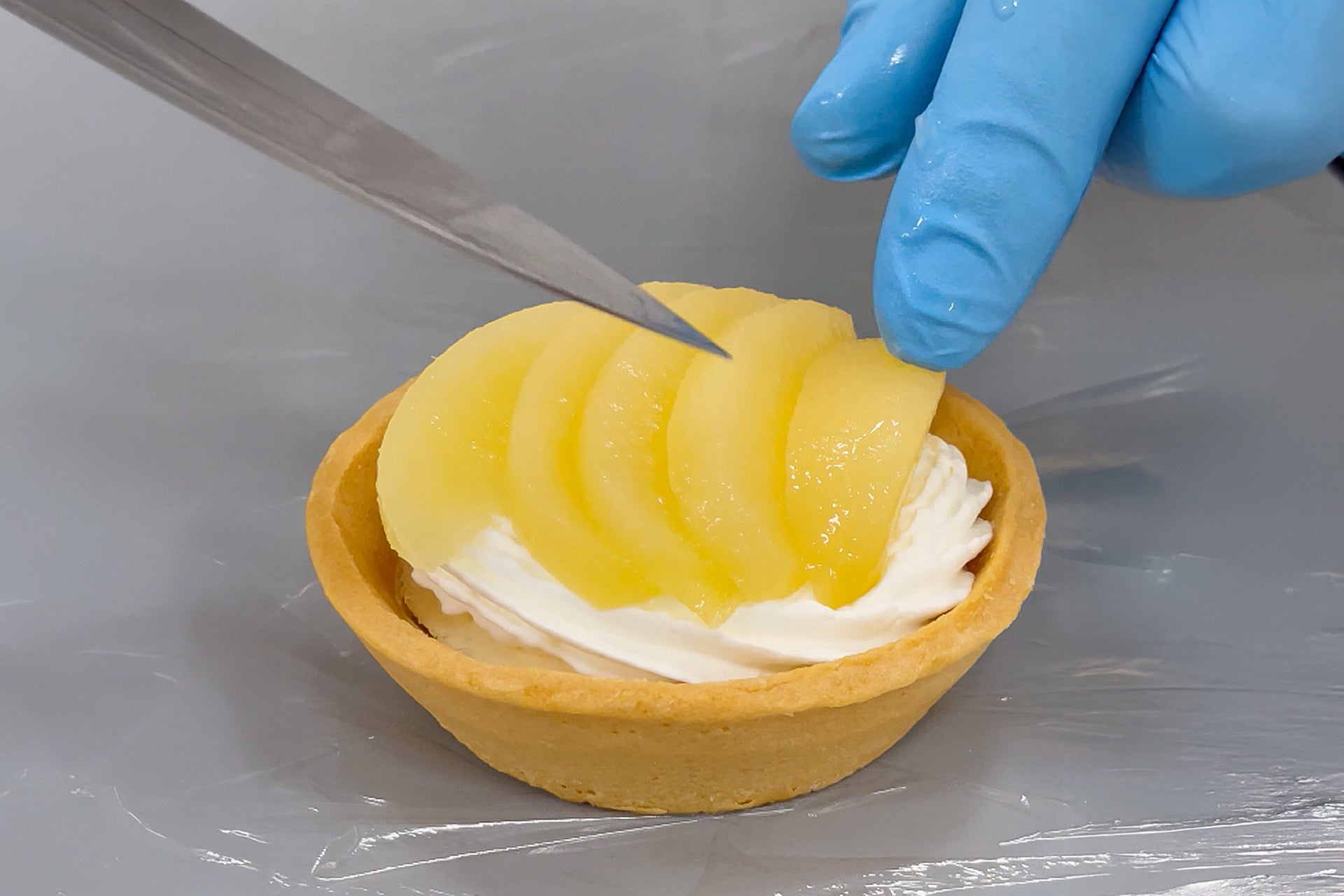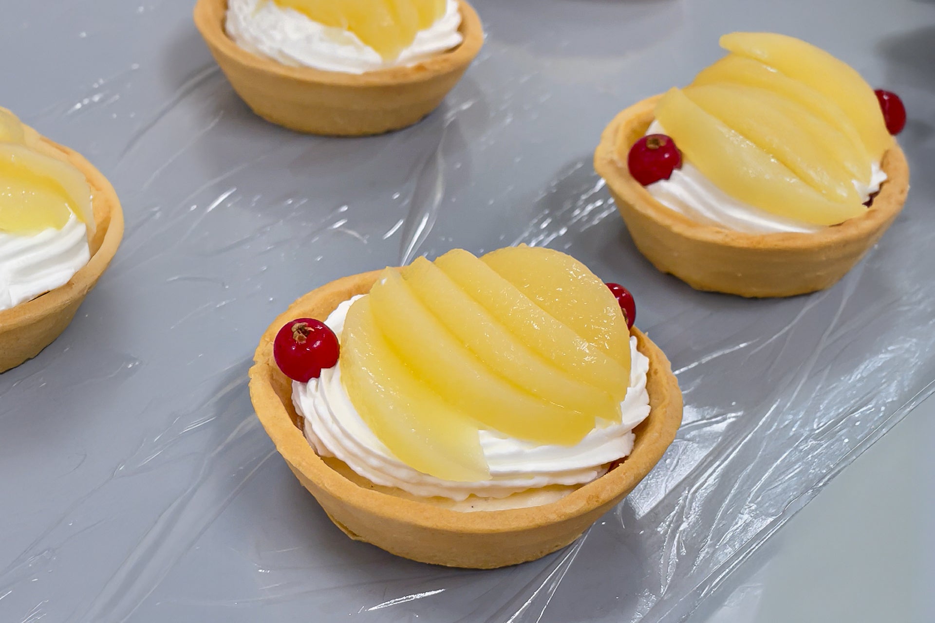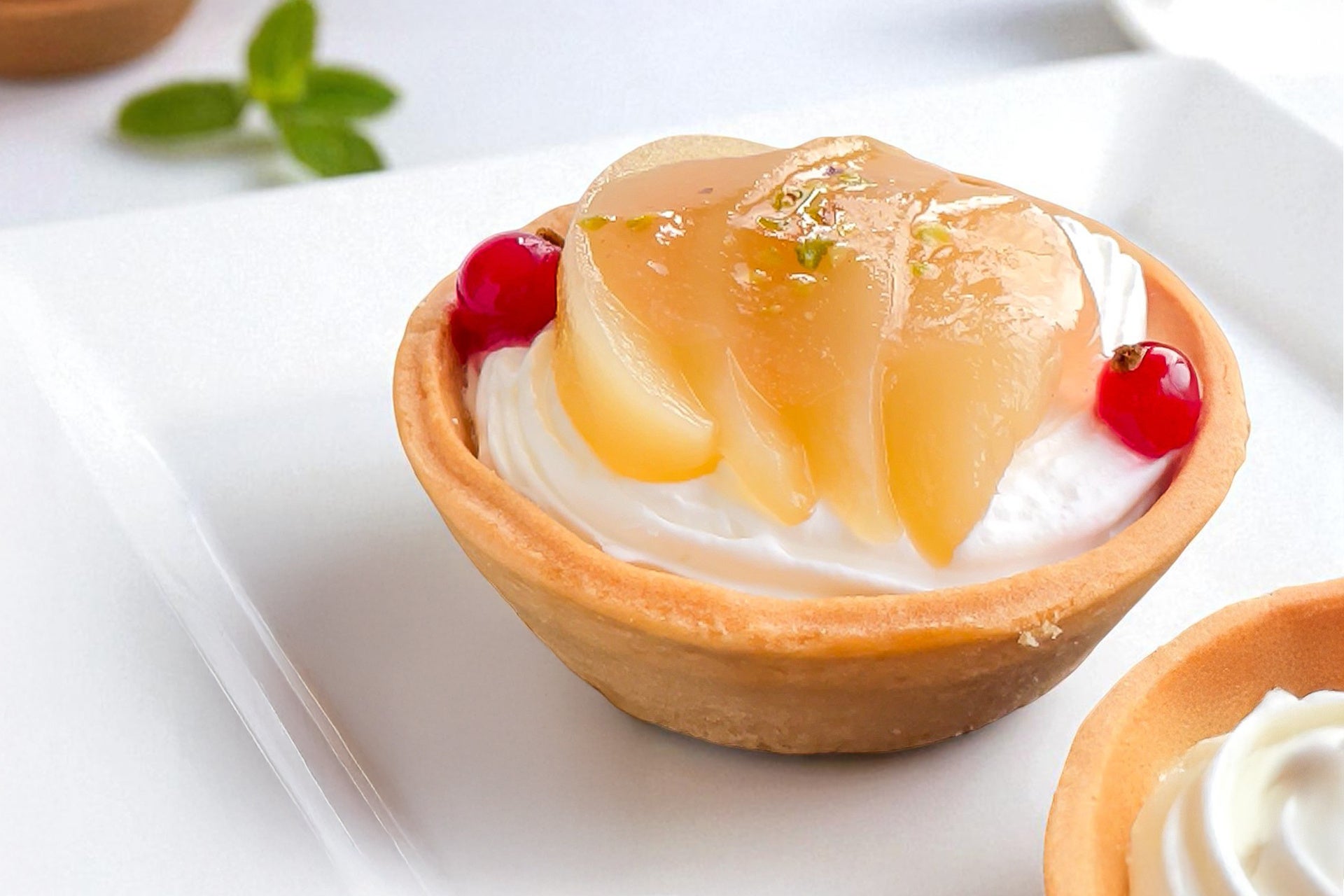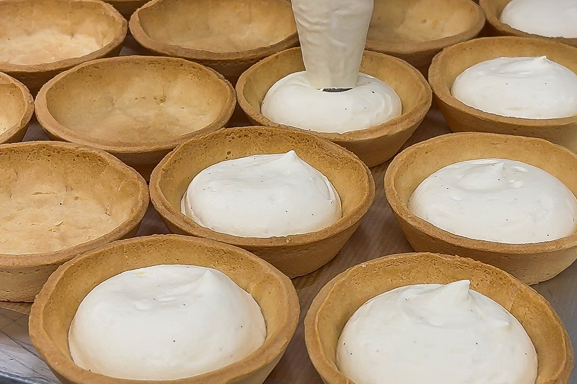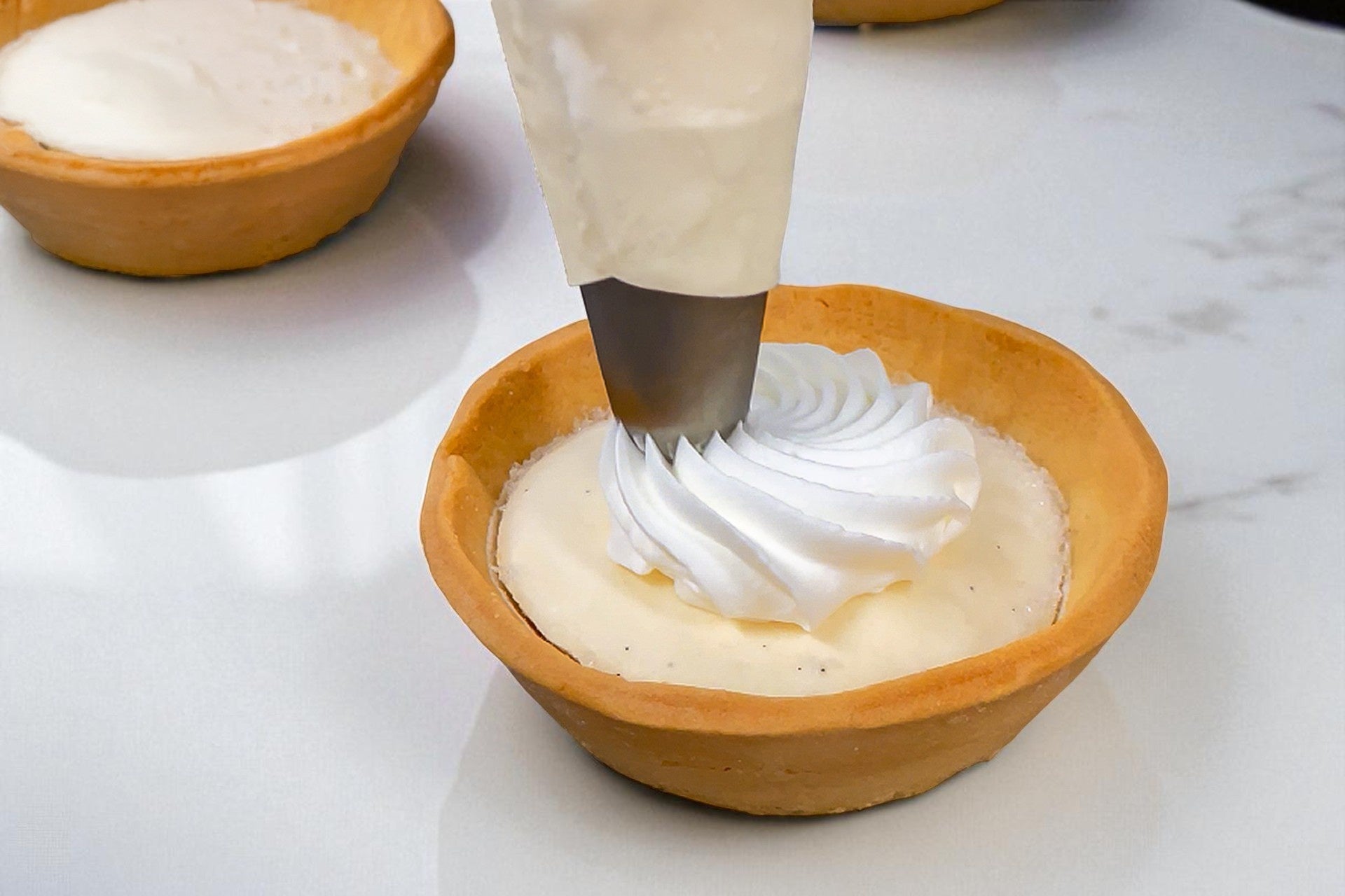 サクサク×ふわとろ食感の秘密は、香ばしく焼き上げたタルト生地に、とろけるバニラムースと生クリームを丁寧に重ねた、こだわりの仕立てにあります。