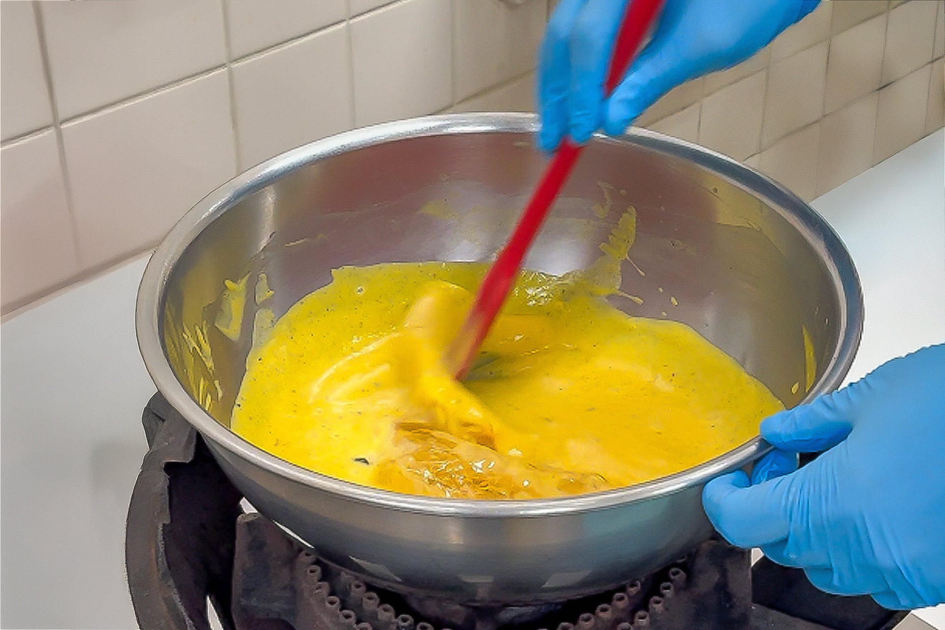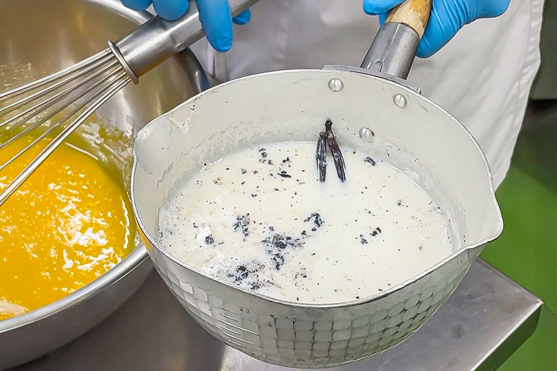 バニラムースの土台には、単なる生クリームの泡立てではなく、フランス菓子の王道「アングレーズソース」を使用。この工程こそが、ムースの風味と奥行きを決定づけます。
