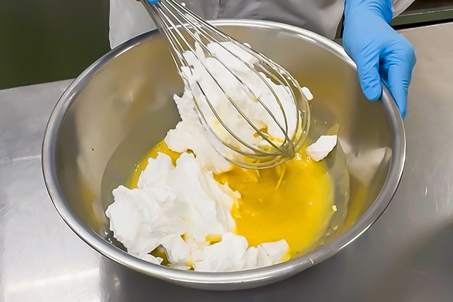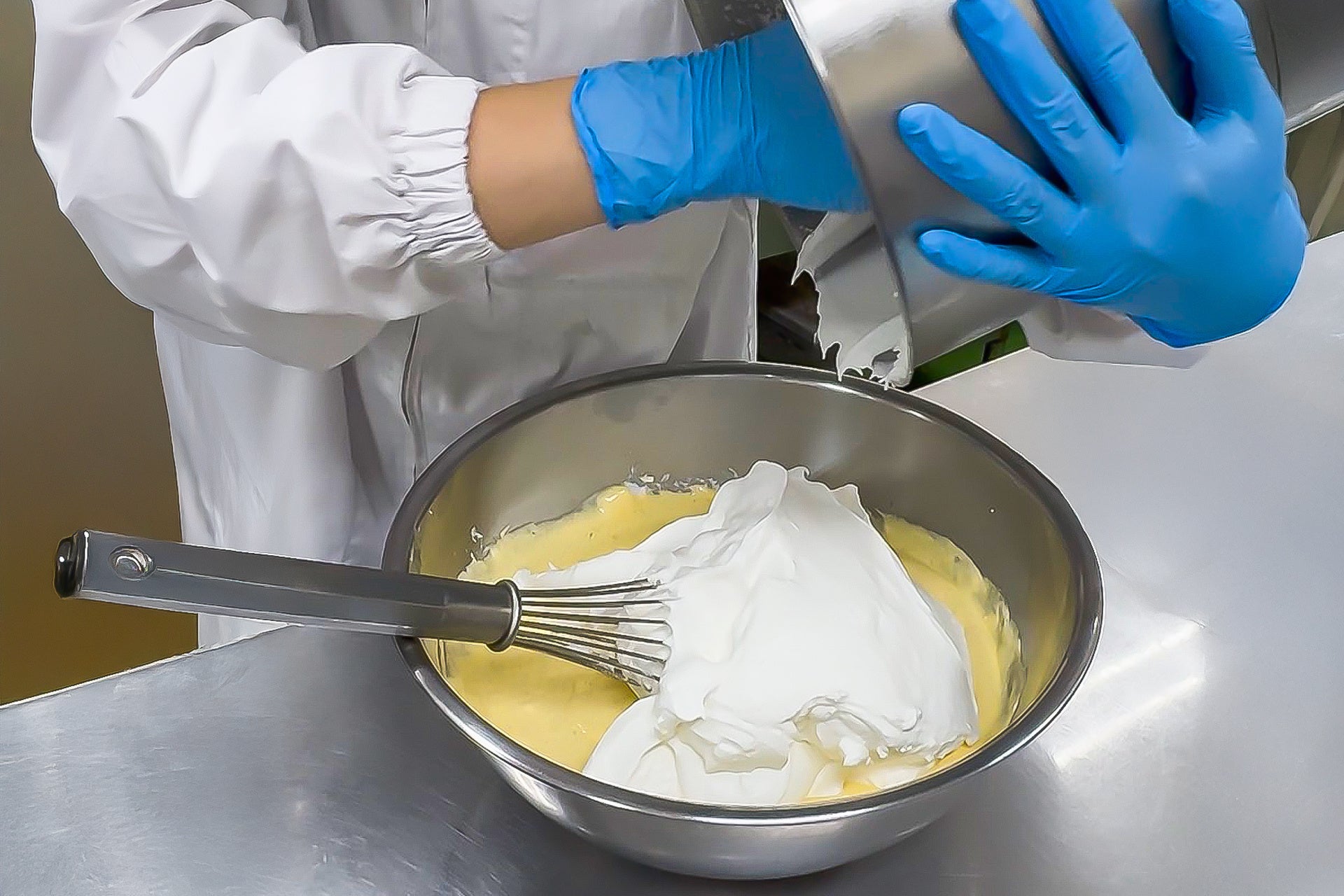 完成したイタリアンメレンゲを、先のアングレーズと混ぜ、最後にふわふわに立てた生クリームを合わせます。すべての気泡を壊さぬよう、手の感覚を頼りに繊細に混ぜ合わせ、軽やかでとろけるような食感を作り上げます。
