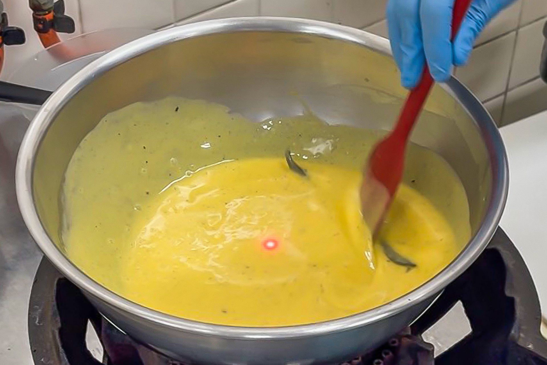 炊き上げの際には、温度管理をレーザー温度計で徹底。一度でも火入れを誤ればすべてが無駄になる、繊細な作業です。