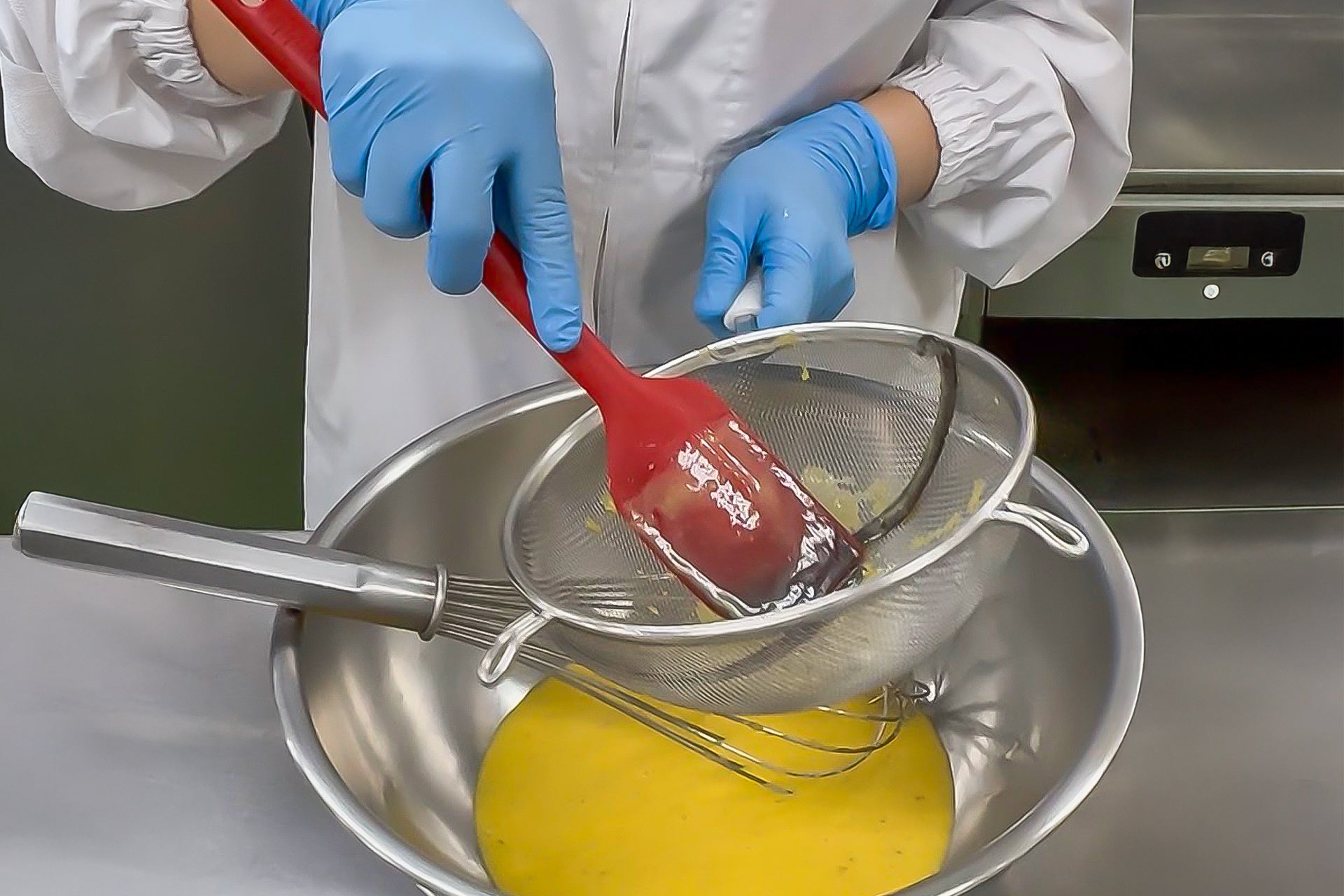 炊き上がったアングレーズソースは、さらに丁寧に漉すことで、より一層なめらかな舌触りを追求。ゼラチンを加え、冷ますことで、ムースの土台が完成します。