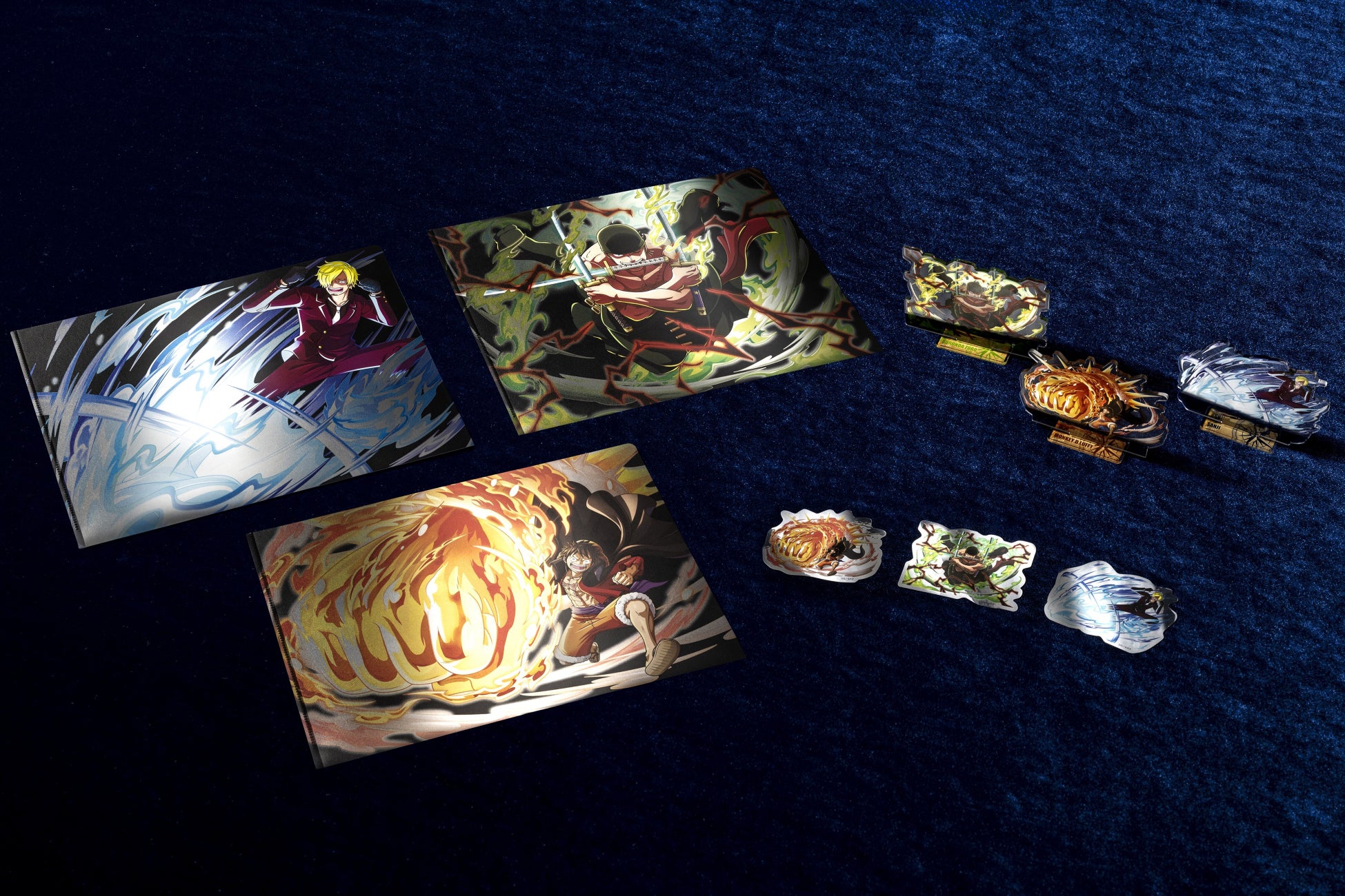 他にも「必殺技」を放つルフィ、ゾロ、サンジのメタリッククリアファイル、メタリックステッカー、箔押しアクリルスタンドや、大人気の「刺繍缶バッジ」の第二弾が登場!