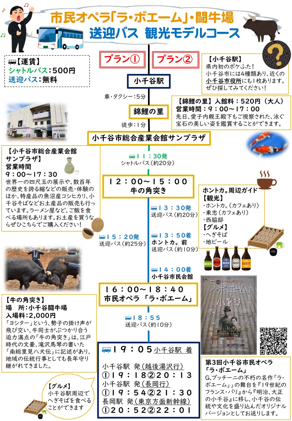 また、オペラ以外の小千谷市の魅力を味わえる観光モデルコースを用意しました。「牛の角突きも、オペラも両方観たい!」という方や「1日で小千谷の魅力をたくさん味わいたい!」という方はぜひこの機会をご利用ください。