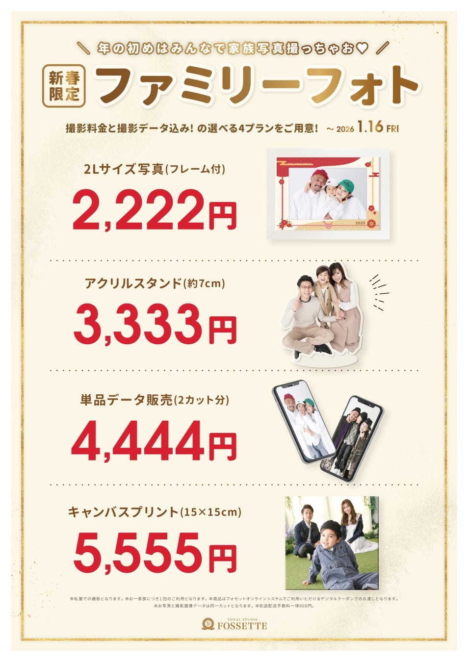 株式会社SAホールディングス(本社:広島県呉市、代表取締役:相川真太郎)のグループ会社である株式会社スタジオアイ(本社:同、代表取締役:同)が運営する「トータルスタジオフォセット」では、毎年恒例となる新春キャンペーン「ファミリーフォト2026」を、2026年1月2日~16日(※一部店舗は1日~)の期間で開催し、撮影料金とデータを含めた2,222円〜の4種類のお年玉プランを用意します。