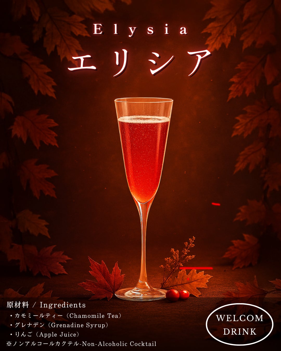 10月2日より期間限定で登場したウェルカムドリンク「エリシア」は、“楽園”を意味する名の通り、口にした瞬間にやすらぎが広がる一杯です。カモミールティーをベースに、りんごのやさしい甘みとグレナデンの鮮やかな酸味を重ねたノンアルコールカクテルで、穏やかな香りとともに秋の始まりを感じていただけます。