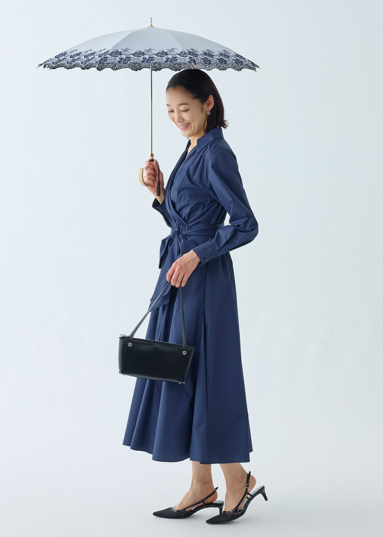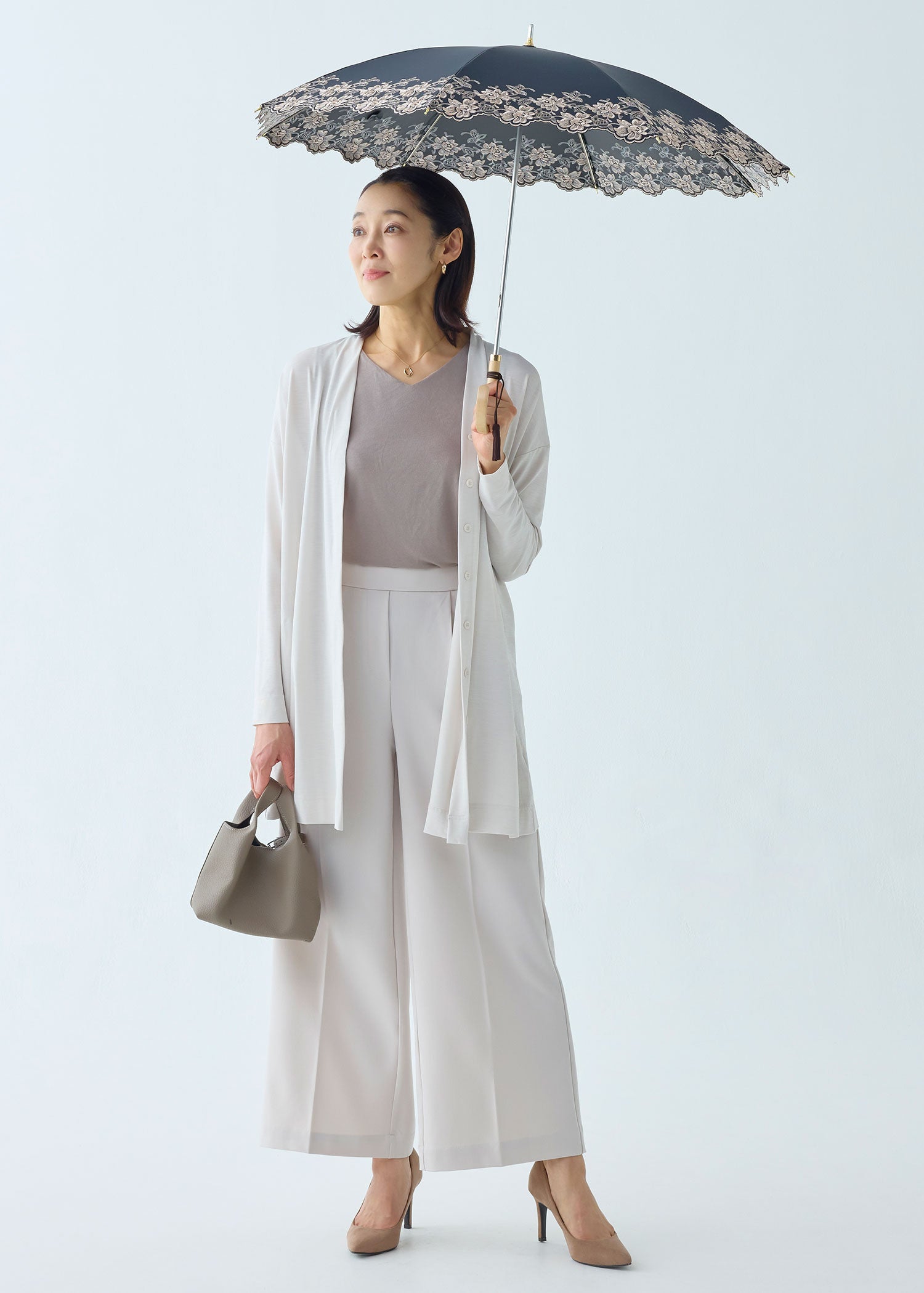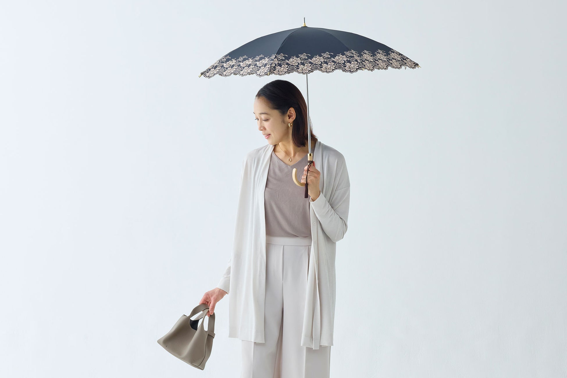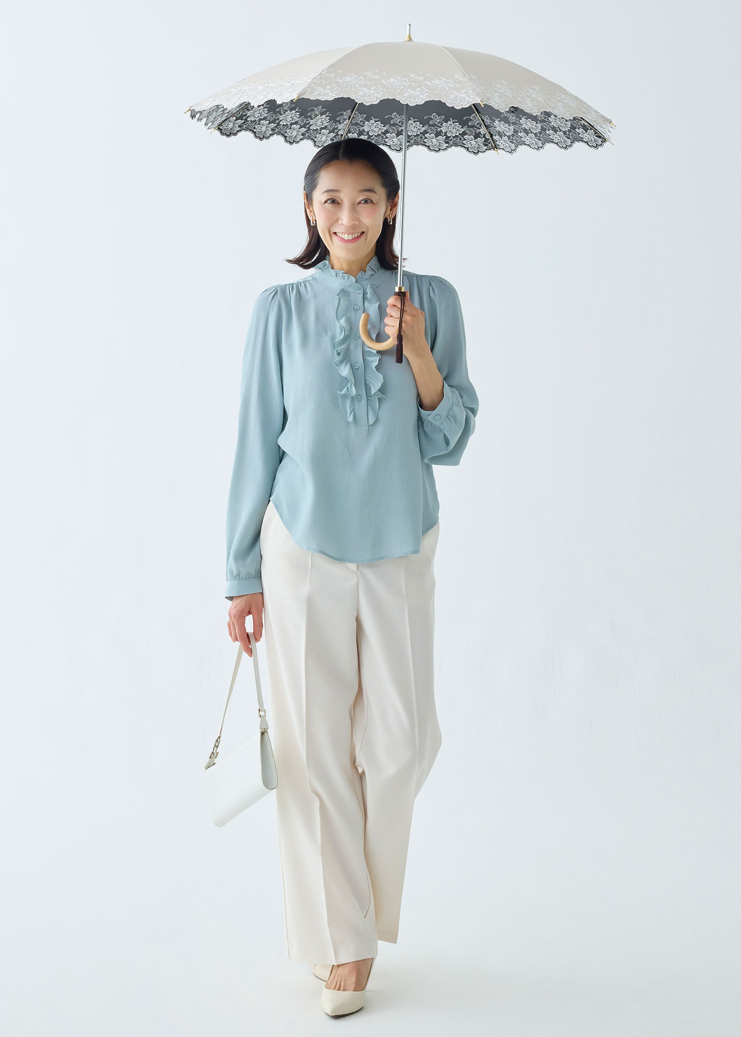 細く繊細なエンブロイダリーレースが可憐で優しい雰囲気の晴雨兼用・一級遮光傘