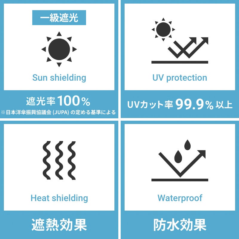 今期の晴雨兼用傘は、昨年に引き続き東レの”サマーシールド”を採用。遮光率100%、UVカット率99.99%、クーリング効果や耐水性などすべての項目で高い効果を発揮します。