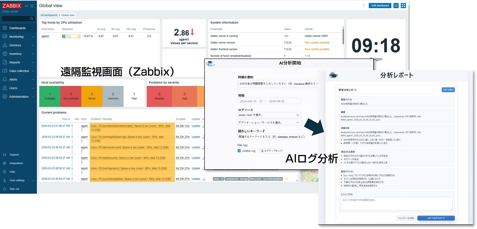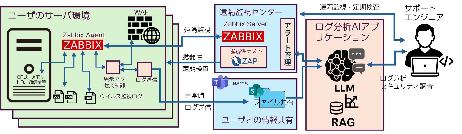 AIログ分析:Zabbixやその他該当サーバから送信されたログを生成AIによって分析の支援を行います。アラートや収集ログの要約・相関から問題点の追及を支援(原因候補、影響範囲、次アクション案の提示)。