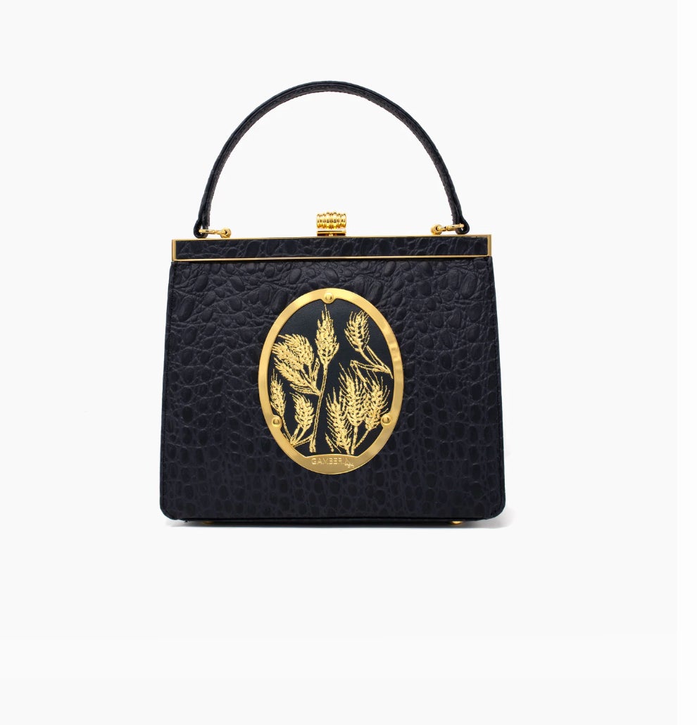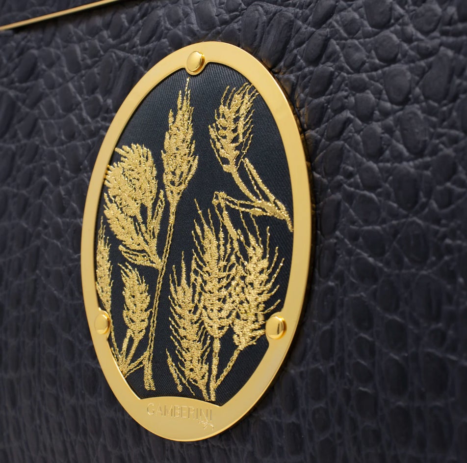 ブラックレザーのボディには、イタリア製の刺繍モチーフが絶妙に組み合わされております。繊細なブラックファブリックの上に金糸がほのかに輝くよう丁寧に仕上げられ、気品と調和の取れたコントラストを生み出しています。これは、時代を超えたエレガンスと伝統への現代的なオマージュです。