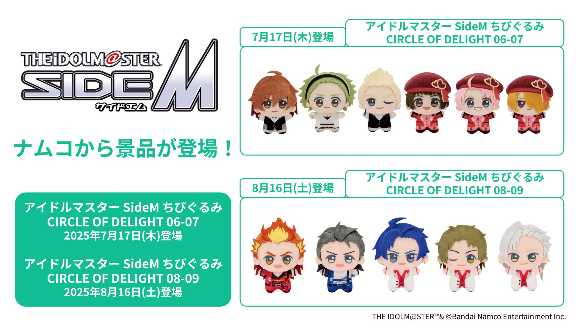 株式会社バンダイナムコエクスペリエンスは、アミューズメント景品「アイドルマスター SideM ちびぐるみ CIRCLE OF DELIGHT 06-07」を7月17日(木)より、「アイドルマスター SideM ちびぐるみ CIRCLE OF DELIGHT 08-09」を8月16日(土)より、「ナムコ」をはじめとしたアミューズメント施設・オンラインクレーン「ナムコオンラインクレーン」(以下「ナムクレ」)で、展開します。本アミューズメント景品は、株式会社バンダイナムコアミューズメントが運営するアミューズメント施設のほか、株式会社イオンファンタジーのアミューズメント施設でも展開します。