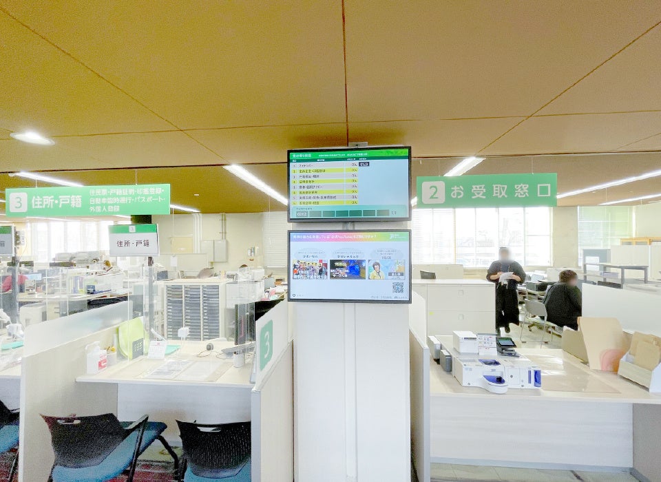 そのような環境のなか、情報システムから印刷用紙、文具・事務用品、店舗開発やプラニングまで幅広くご提案する北海道の老舗商社「大丸株式会社」と連携し、美唄市庁舎内のレイアウト変更に合わせ、当社は番号案内システム「Turn NAVI」を美唄市役所の市民課・国保年金課・税務課に設置いたしました。これにより、来庁者が窓口の待ち状況を把握しやすいようにし、来庁者の利便性を向上させるとともに、自治体職員様の窓口業務効率化にも繋がることが期待されています。加えて、同フロア内に広告付きモニターを併設することで、設置・運用に係る各種コストの低減も可能となります。