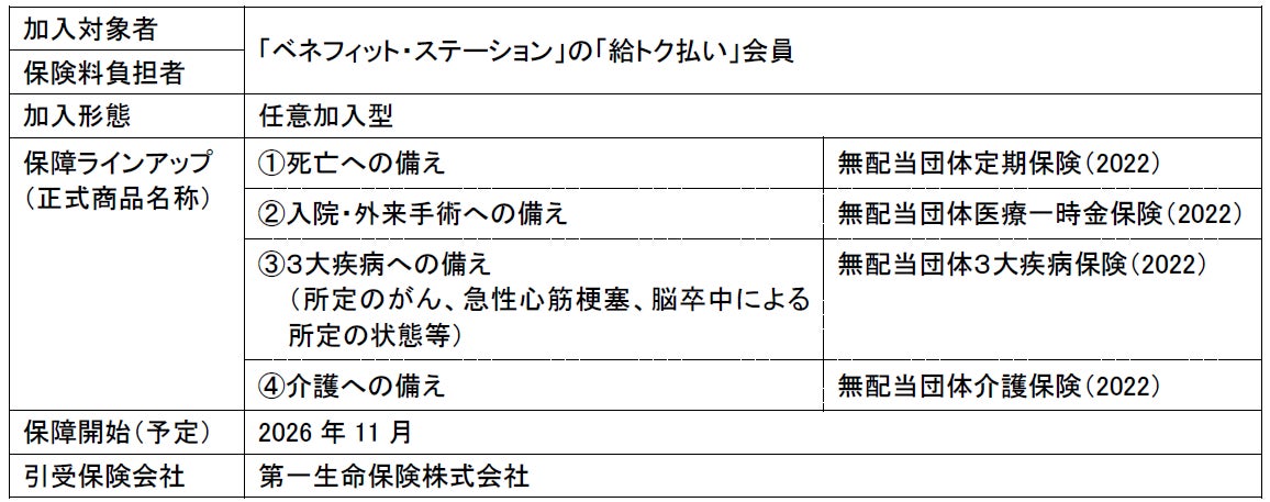 新しくサービスに加わる団体保険は、第一生命保険株式会社(代表取締役社長:隅野 俊亮、以下「第一生命」)を引受保険会社とする「ベネトクほけん」です。