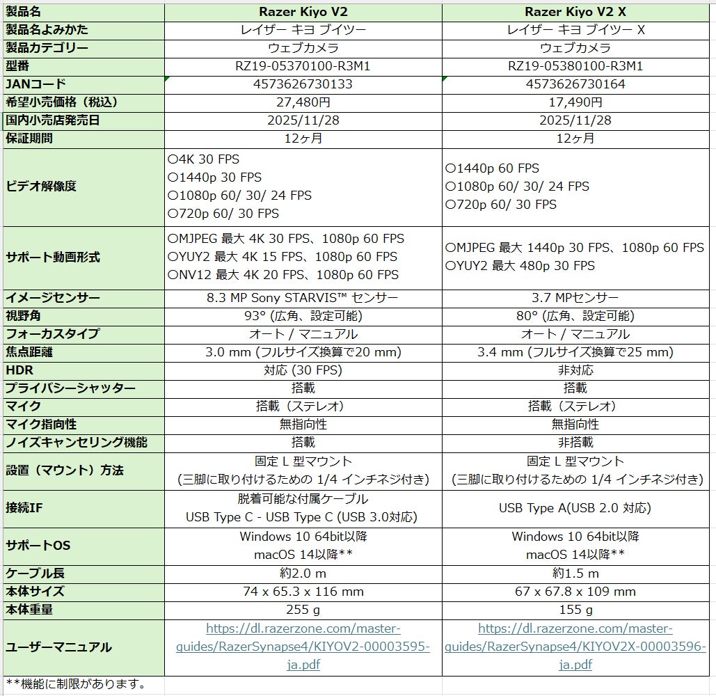 ゲーマー向けライフスタイルブランドとして世界をリードするRazer™(本社:米国カリフォルニア州およびシンガポール)の日本法人Razer Japan株式会社は、ウェブカメラ新製品Razer Kiyo V2、および、Razer Kiyo V2 Xの日本国内での発売日を2025年11月28日(金)に決定しました。