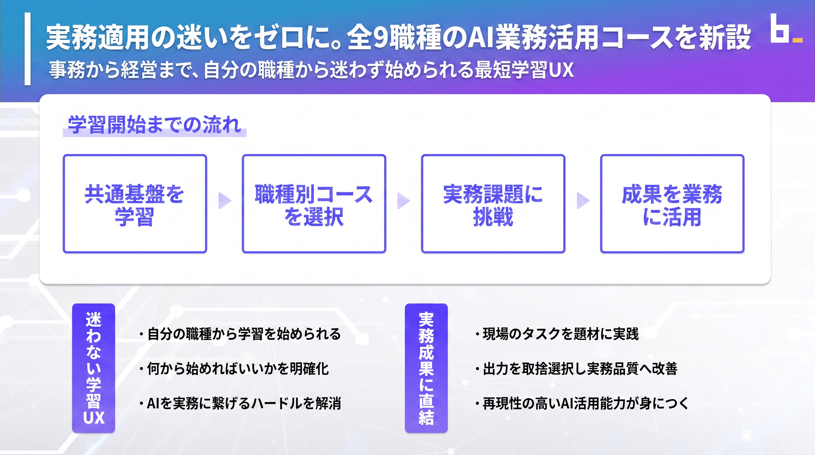 — 事務から経営まで、自分の職種から迷わず始められる最短学習UXを構築 —