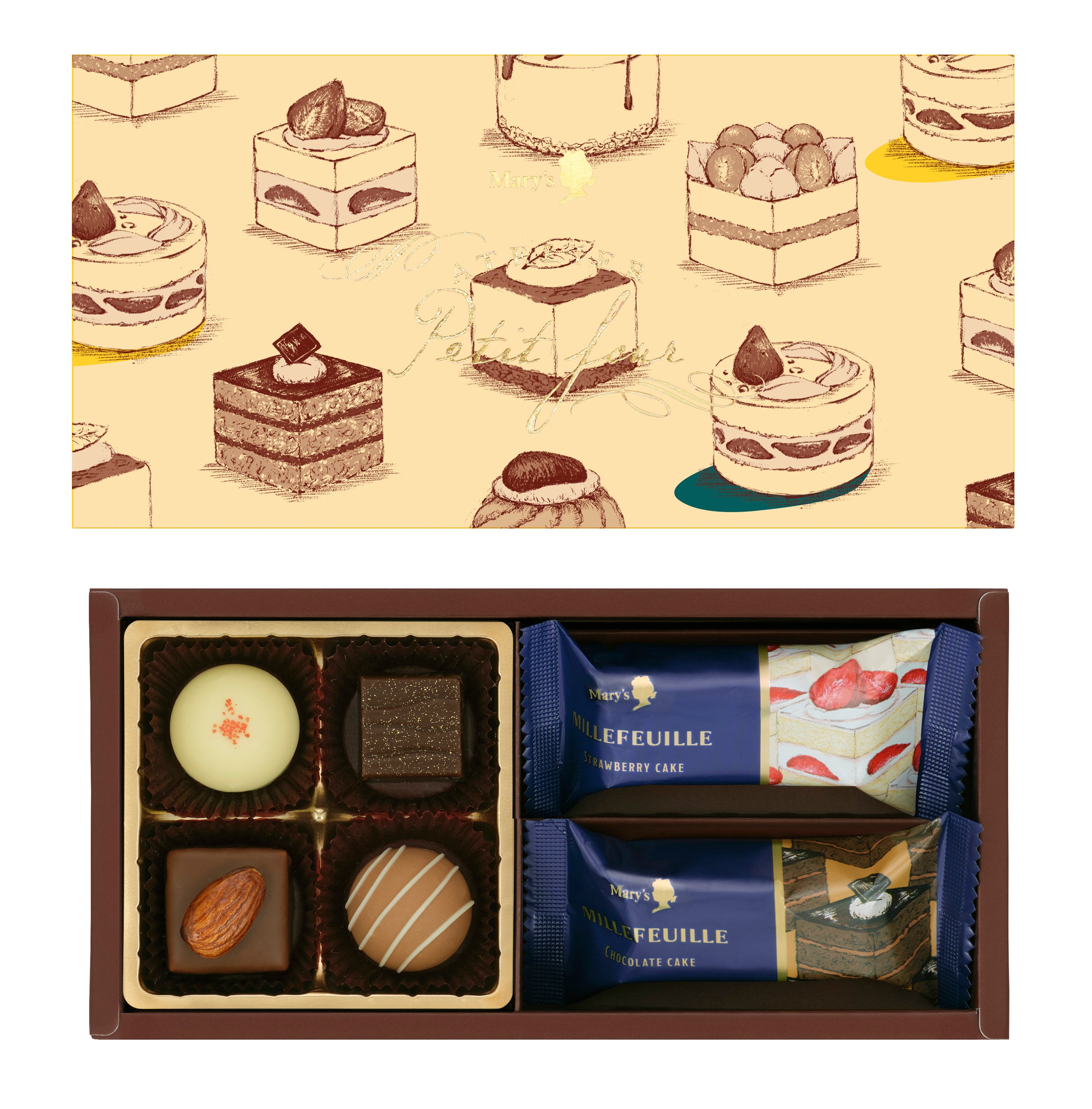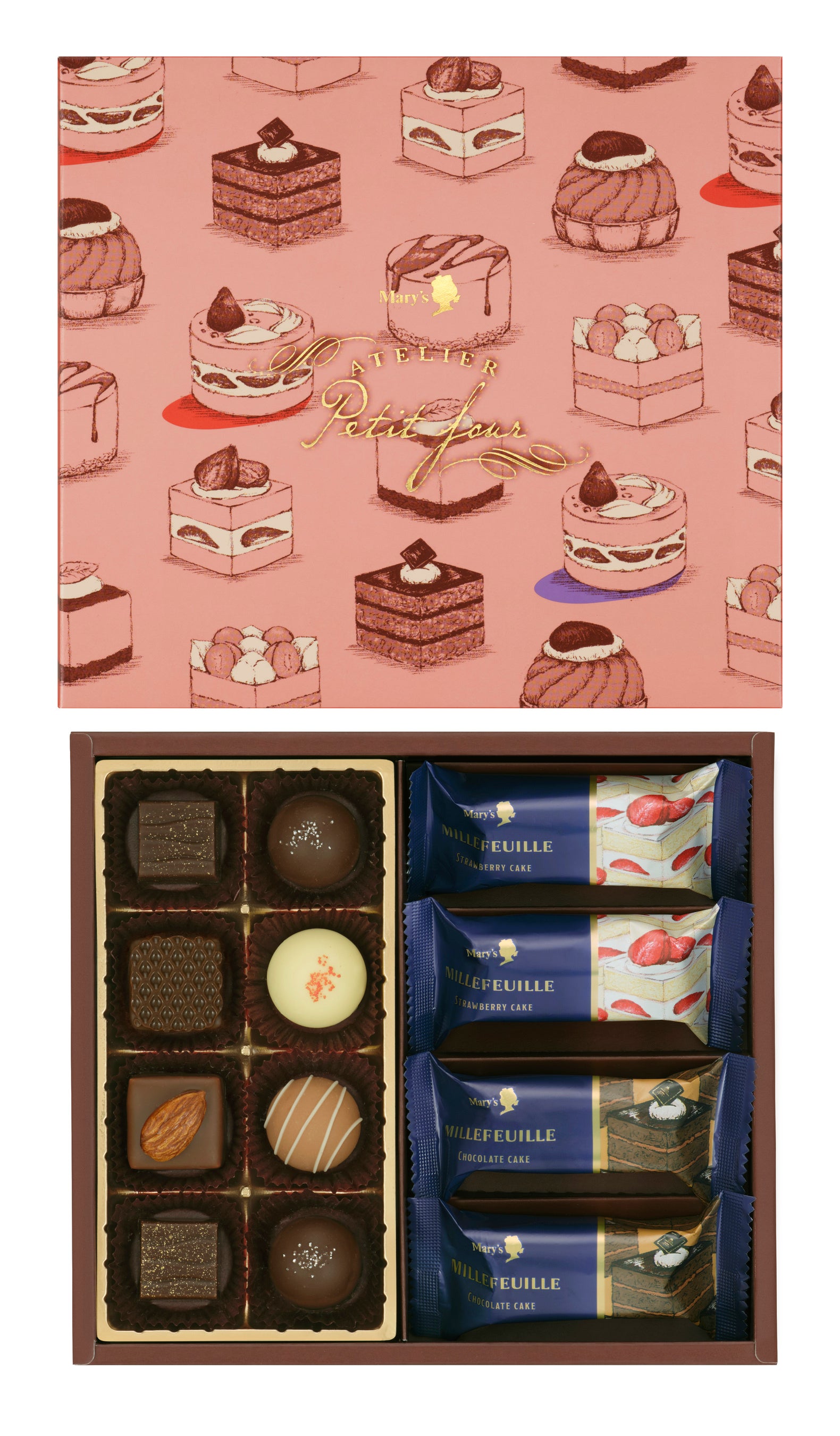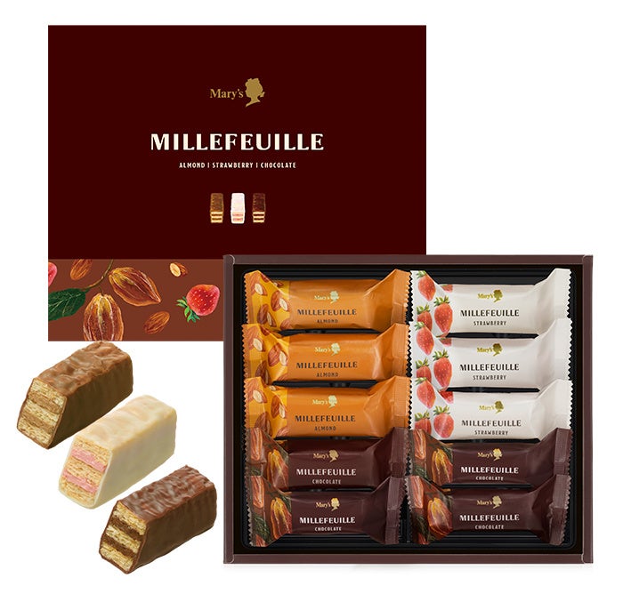 食感が楽しい素材をクリームに合わせたリッチミルフィーユと、ケーキをイメージしたチョコレートの詰め合わせです。
