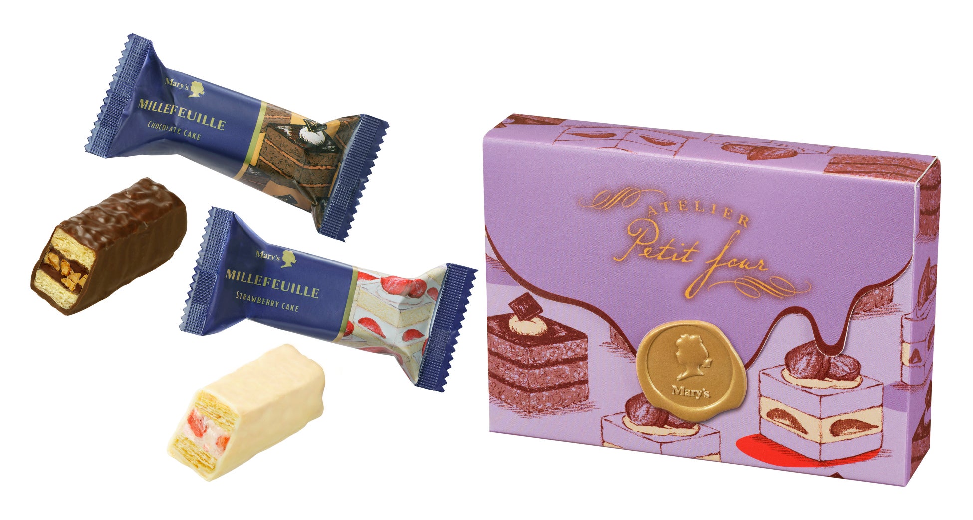 まろやかな苺クリームに甘酸っぱいフリーズドライの苺を合わせたストロベリーケーキ風、濃厚なチョコレートクリームにカリッとした食感のペカンナッツを合わせたチョコレートケーキ風、2種類のリッチミルフィーユを詰め合わせました。