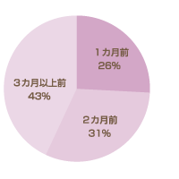 以前のアンケート調査結果によると、自分たちで会場を選ぶカップルが70%近くを占めるため、2次会の準備期間も3カ月以上取っている花嫁が40%以上も。また、ウエディングシーズンに結婚式を挙げる場合は、会場確保のためにどうしても早めの行動になってしまうみたい。