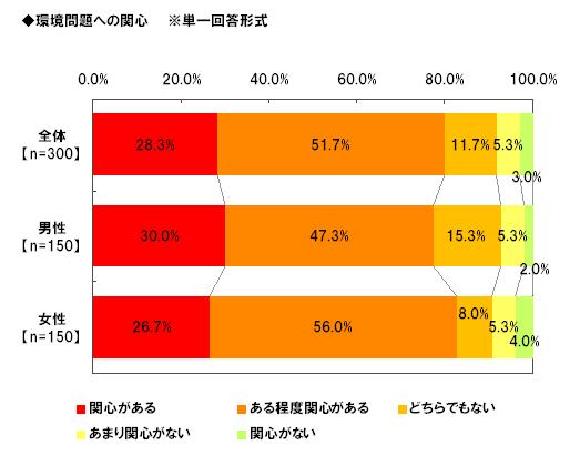 環境問題への関心の有無を尋ねたところ、8割の回答者が「関心がある」(「関心がある」「ある程度関心がある」の計)と回答し、大半の人が環境問題に関心があることがわかりました。